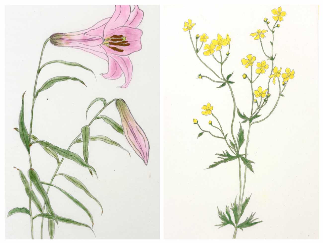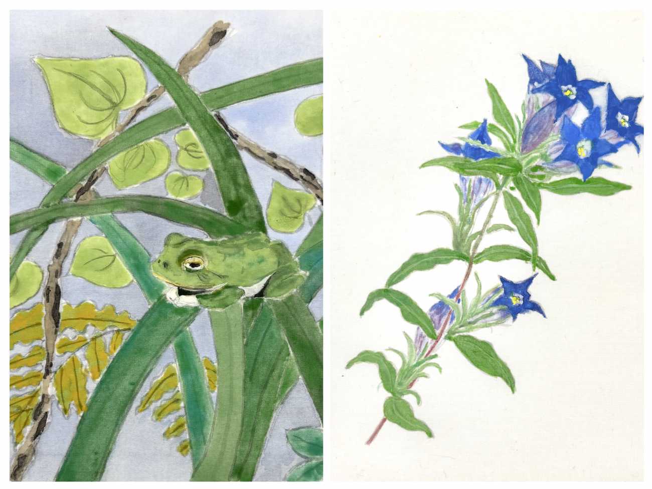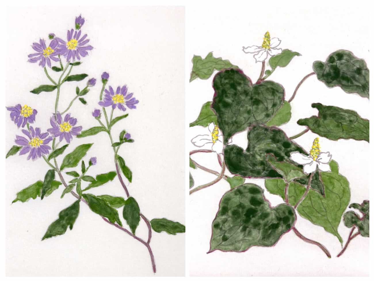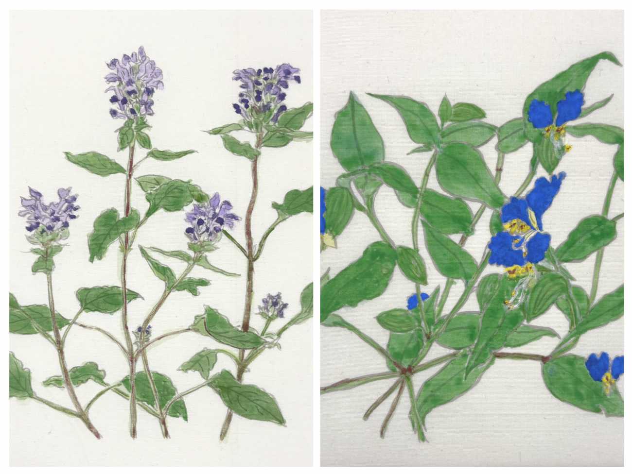ここに咲く花たちも絹本で描き、屏風の裏面に色紙を散らすように配置しました。