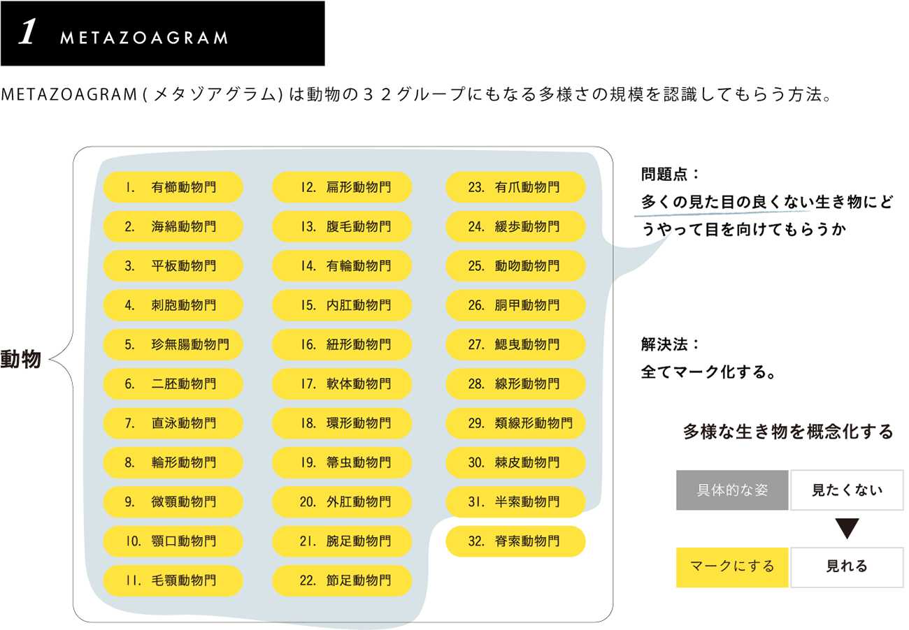 一つは動物の多様性を説明するマークである。分類学の分類群に従って分けられた動物グループ(門)をマークで表現し、動物の多様さとその規模感を表した。このマークをメタゾアグラムと名付けた。