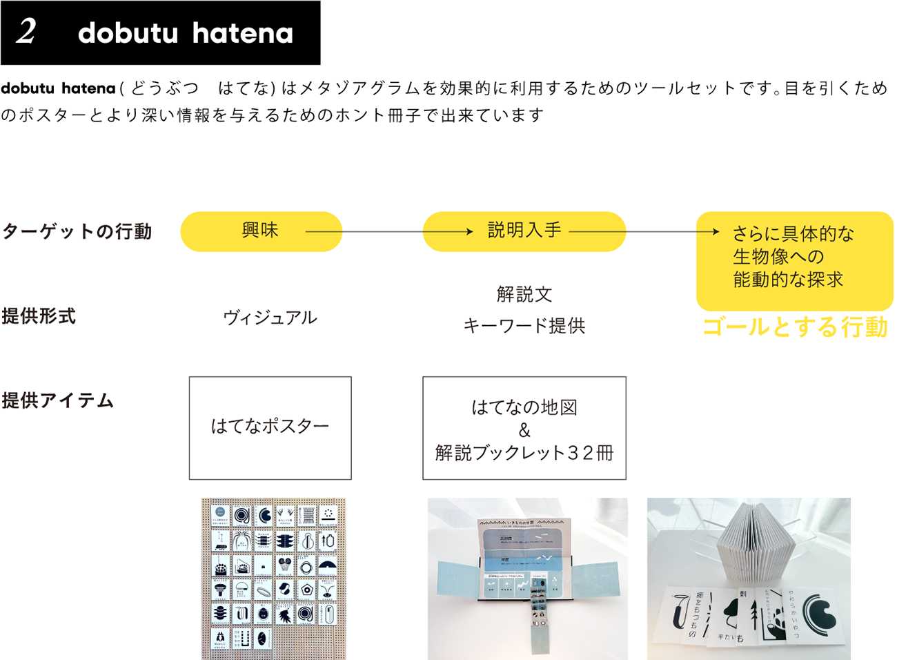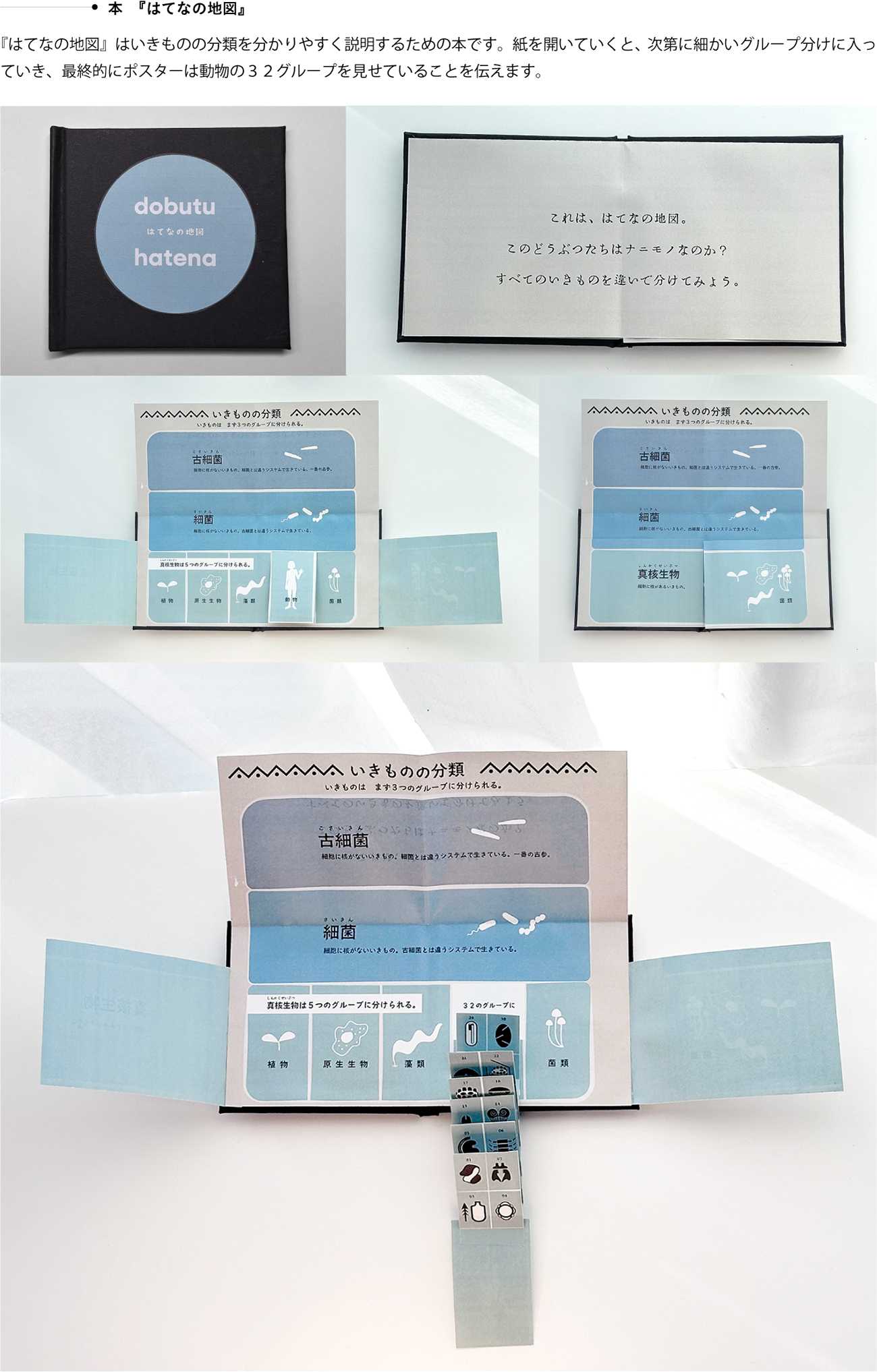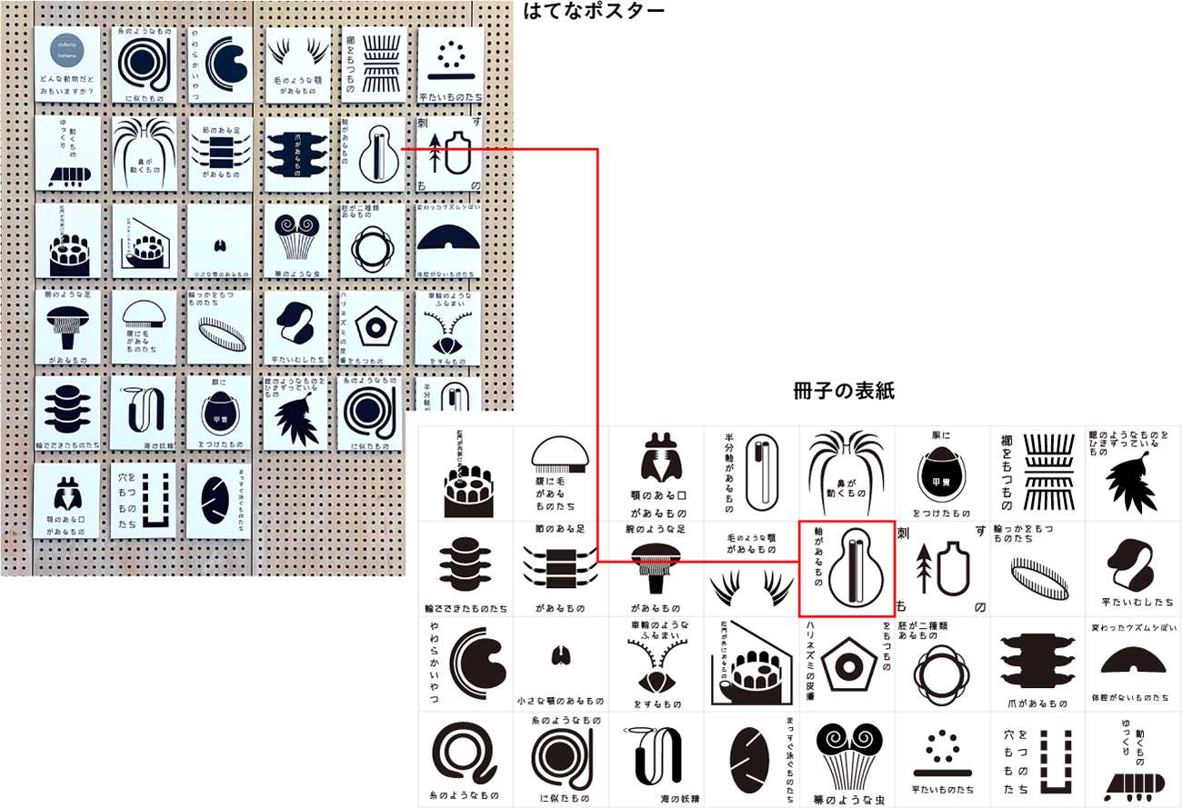 もう一つはそのマークを使って具体的に動物の多様性を説明する教育ツールである。ポスターと本、冊子から成る。内容に踏み込んでもらうためのもので、このツールセットをdobutu hatenaと名付けた。