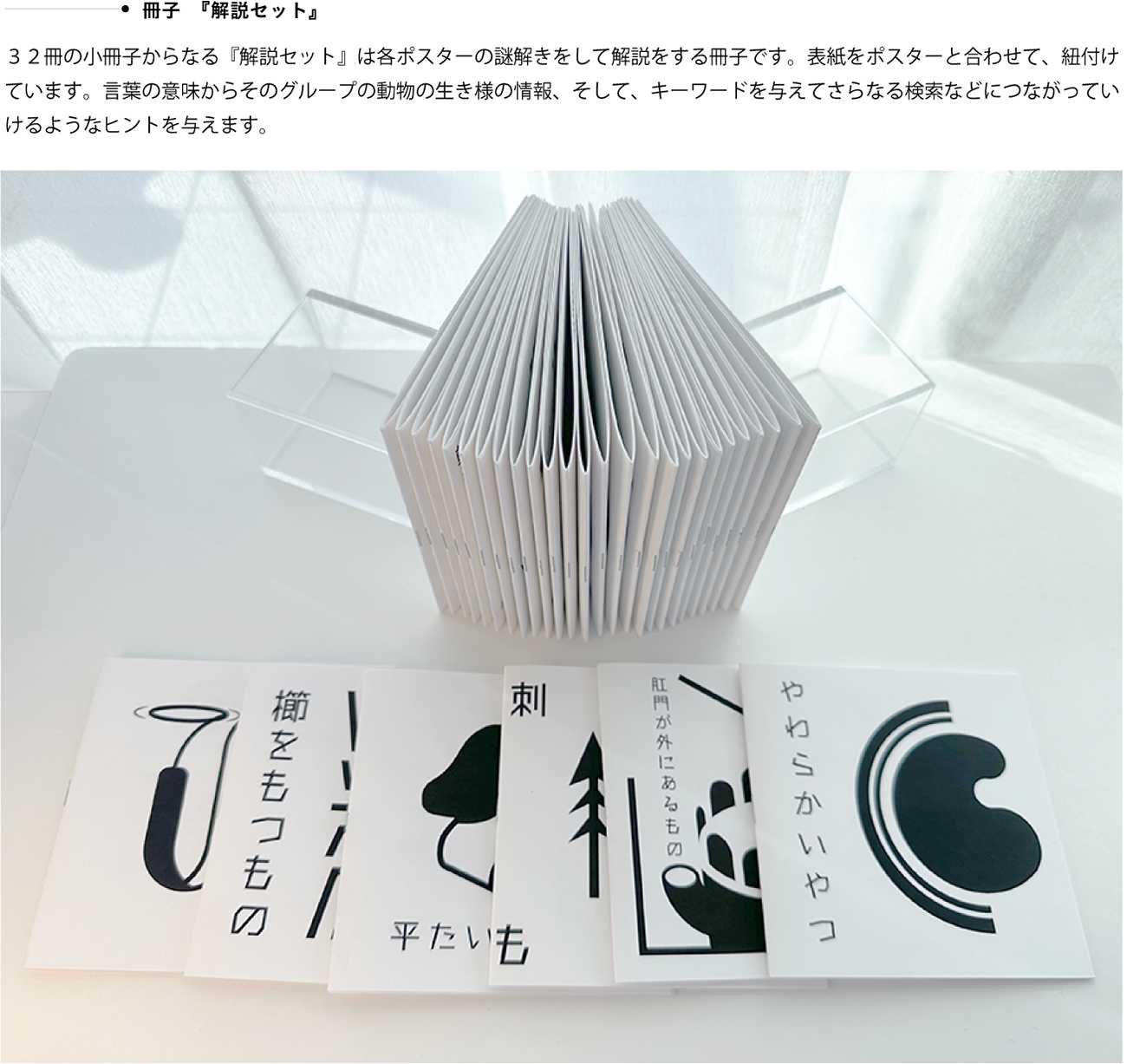 32動物門のマークのデザイン、ポスター32種、本(9.5cm x 10 cm)1冊、冊子32冊セット(各10cm x 10cm)、パッケージ