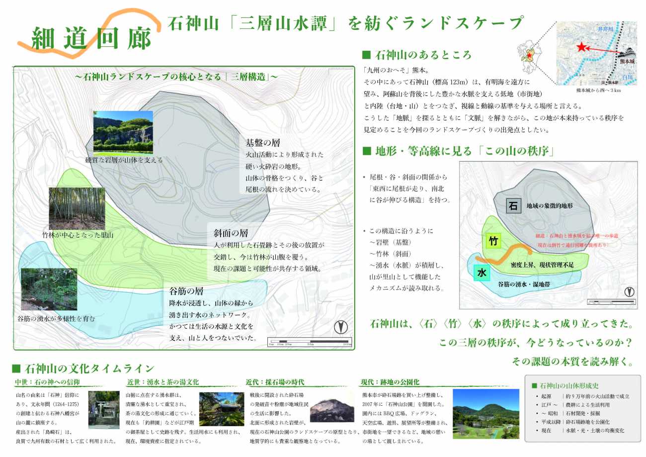 対象地は、熊本市西区石神山の緩やかに傾斜する丘陵地の竹林。熊本市の都市公園である石神山公園を中腹に、裾野を住宅地に囲まれたこの地は、里山地形を残す一方、山林管理の弱体化により竹が密生し、光・風・水の循環が停滞している。里山が機能しなくなった現代において、人と自然との境界が曖昧になった場所であり、単なる緑地整備ではなく、管理構造そのものの再設計が求められる場所である。