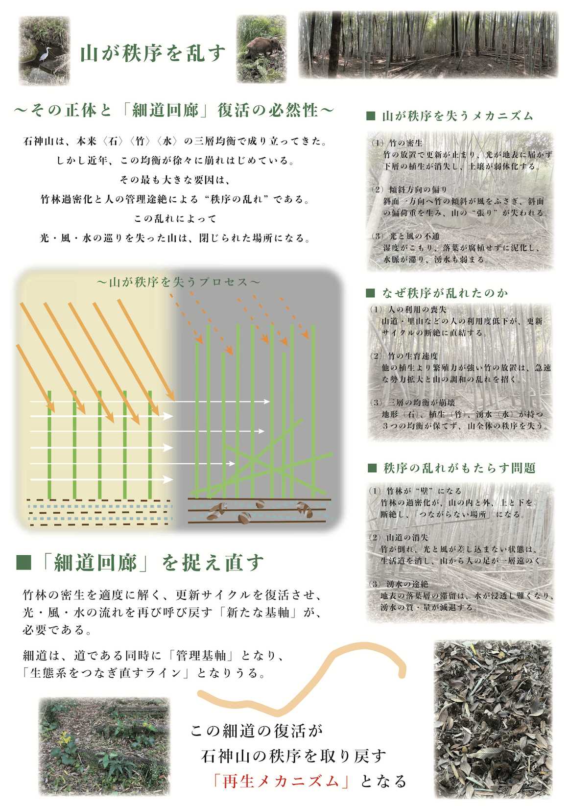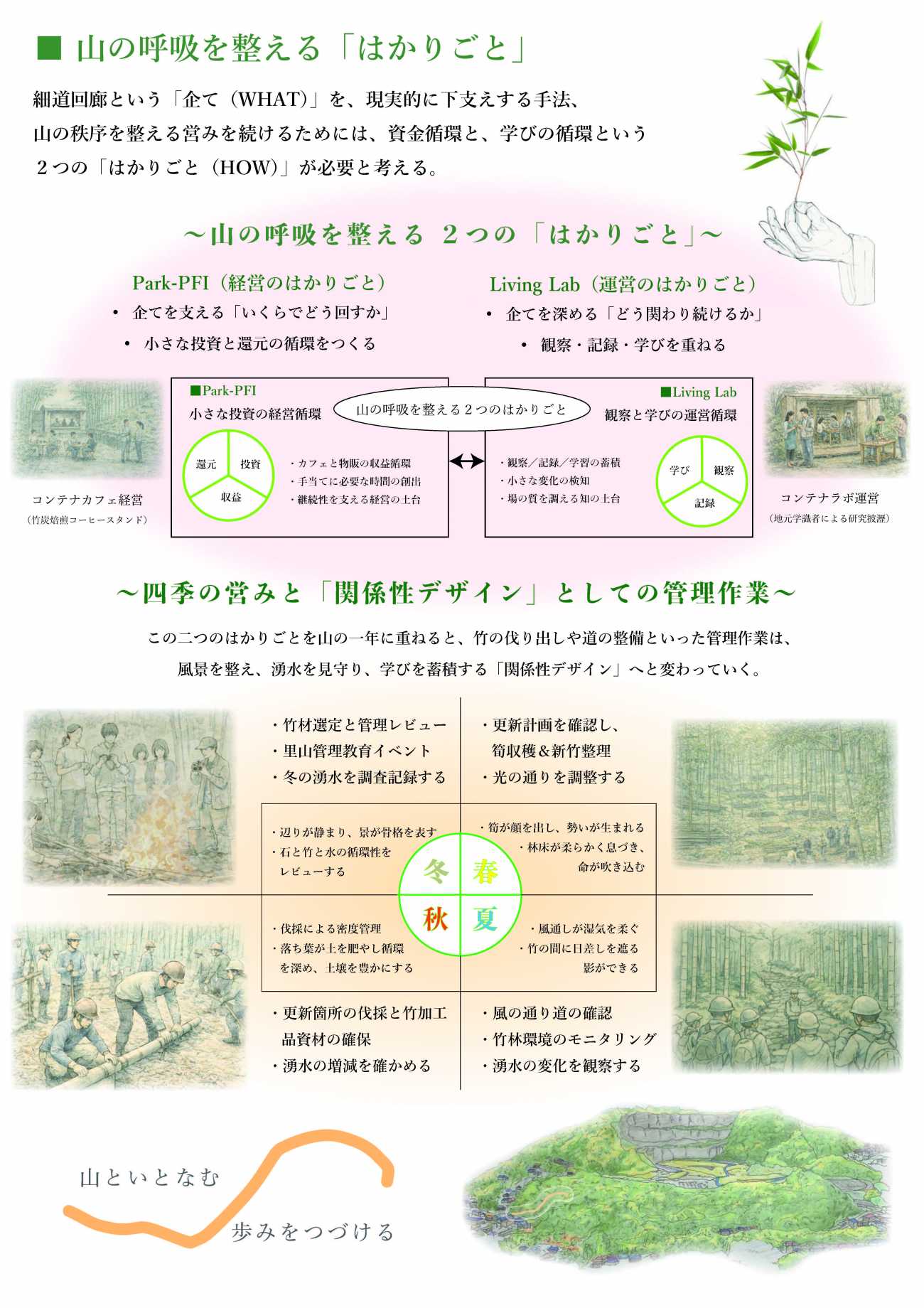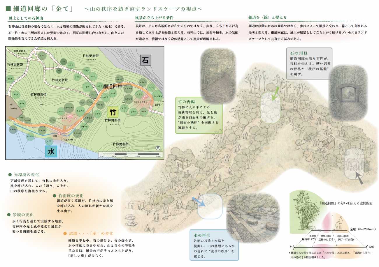 細道回廊は、「里山という機能」が成り立たなくなった現代、人が「小さな山道」を起点に山への関与を続ける地域設計への小さな試みである。従い、園路設計のアプローチで対象区画「細道回廊」を整えることに加え、それを囲む持続可能な関与条件そのもの(竹林)に働きかけること、ランドスケープアーキテクトの職能を通じた社会教育的な実装実験である。