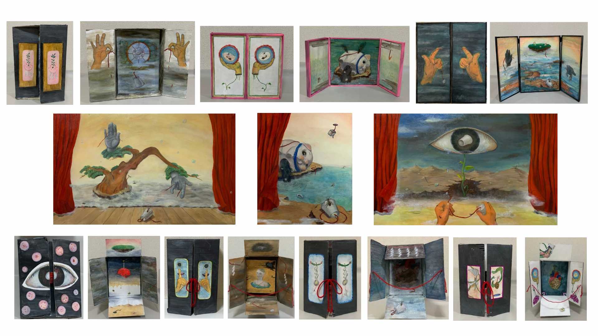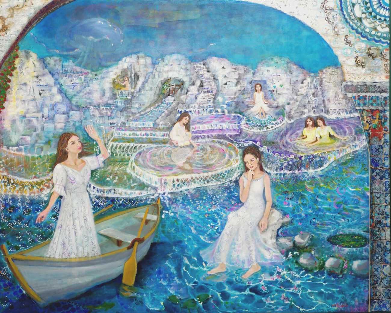 天空で展開される相反する事象は、女性、月、星、海、水に関連するモチーフと色彩・模様で、平和への願いを込めた。模様の背景には、歴史、文化、信仰が密接に結びつき、長寿、繁栄、魔除けなど人々の様々な願い、深い意味が込められている。観る側の感情や記憶と結びつき、言葉では伝えきれない思いを伝えてほしい願いを込める。
