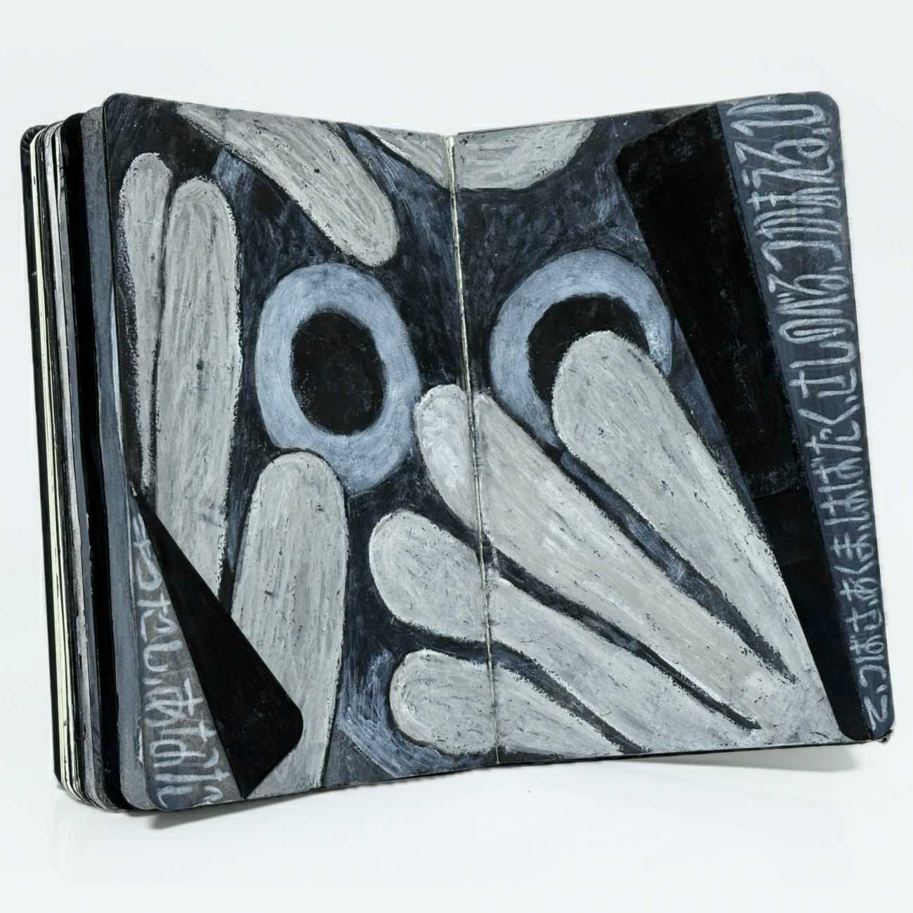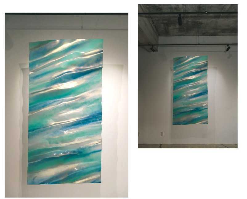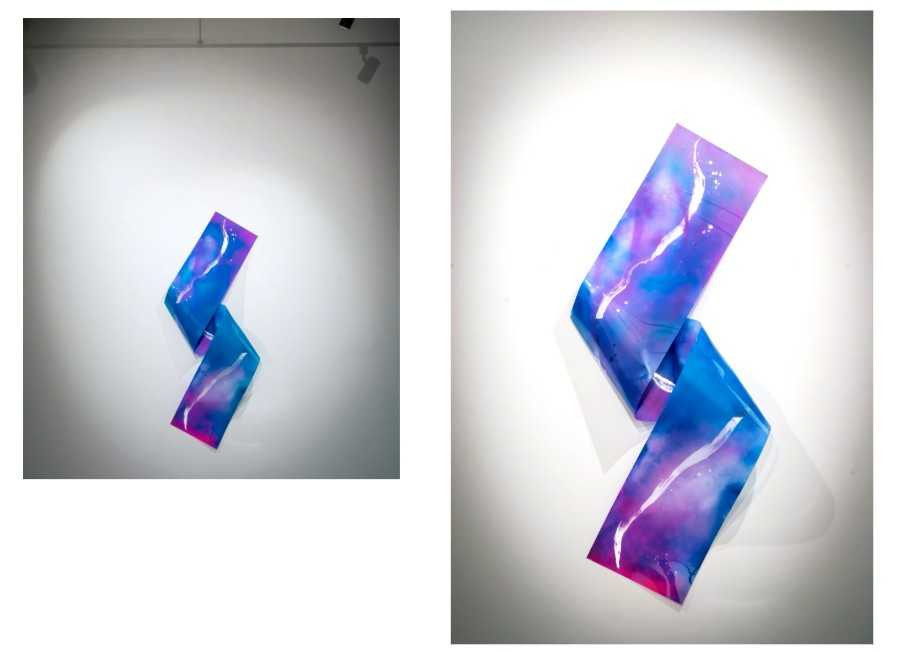 支持体には極薄のアクリル板を用い、スプレーペイントとラバーセメントによる層を重ねることで、光を透過・反射させる構造を形成した。さらに板を曲げることで物理的な奥行きを生み出し、平面でありながら立体的な広がりを持つ空間を構築している。鑑賞者の視点や身体の動きに応じて線や色の関係性が変化し、時間が揺らぐような体験が生まれる。