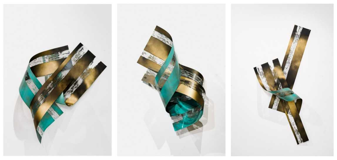 「跳」は上へと跳ね上がる瞬間、「転」は渦を巻く動勢、「立」は静止の状態を表している。三つはいずれも同じの造形から生まれ、それぞれ異なる時間の局面を示している。作品は固定された形を提示するのではなく、鑑賞者の身体や視線の動きに応じて表情を変える空間として存在する。物理性と絵画性が交差する場に生まれる「時の間」を、透明素材の重なりから生じる余白を通して、光と気配を宿す空間として立ち上げる。時間を描くのではなく、時間が立ち上がる場を造形することを本作は試みている。