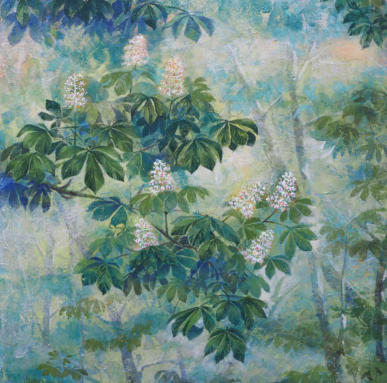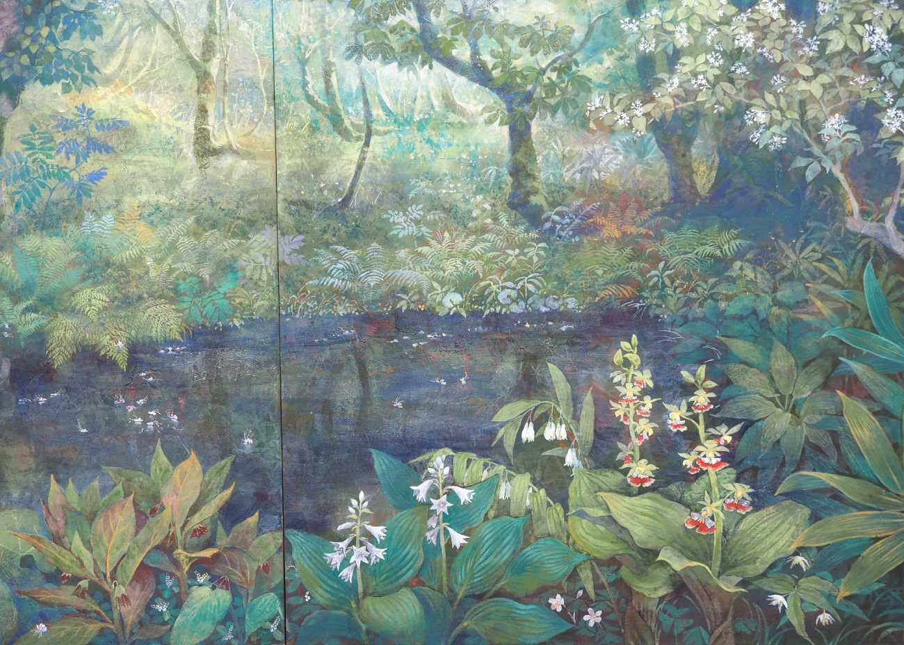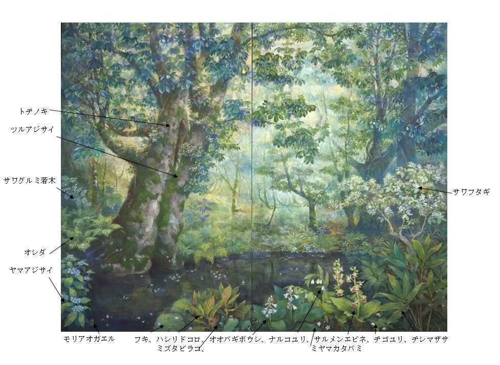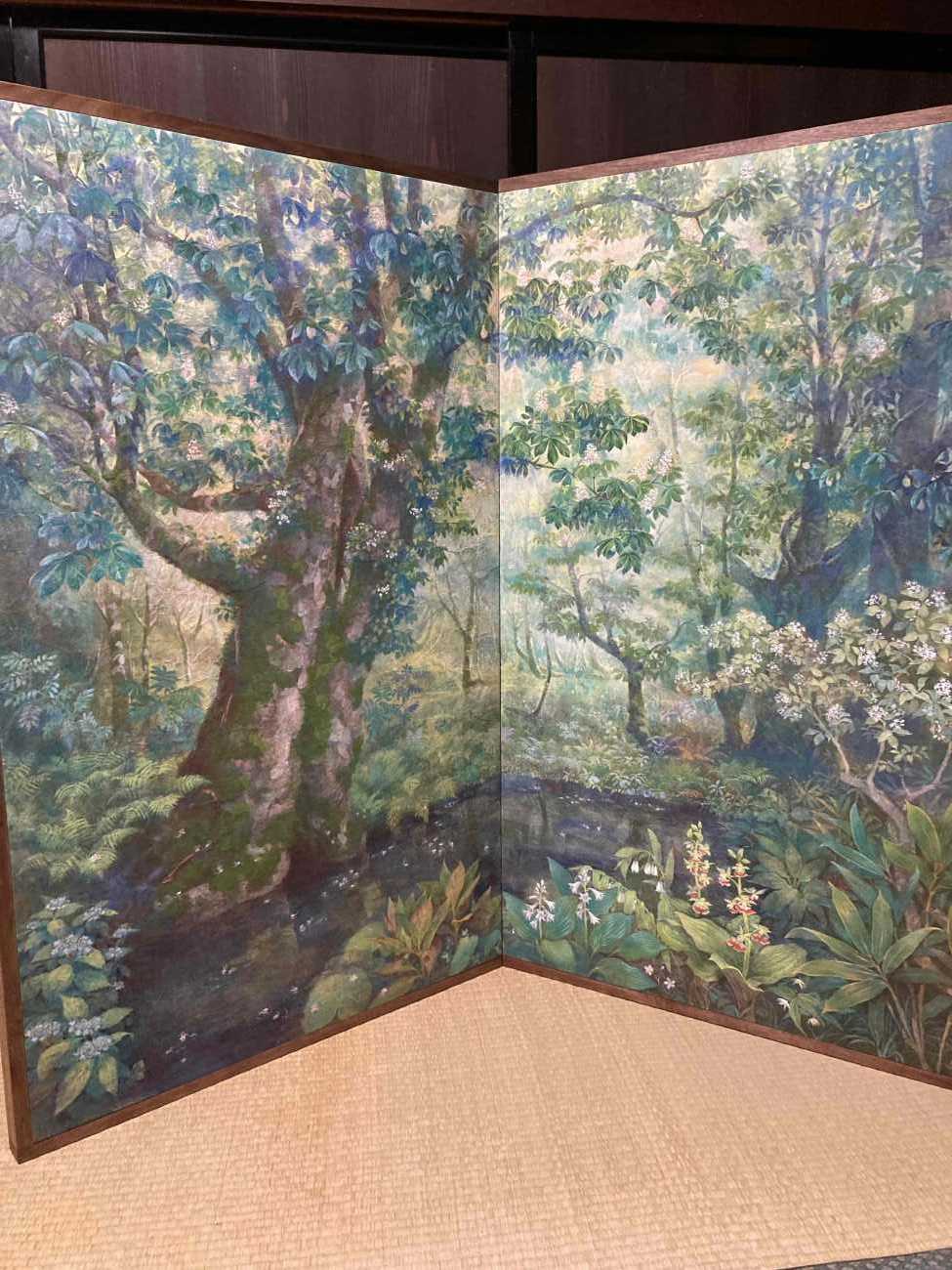 巨樹に咲く小さなトチノキの花、その花柄は日本画の胡粉で表現。池の奥へと続く森の広さと深さを、構図による効果だけではなく、2曲屏風とすることでより強調して表現した。