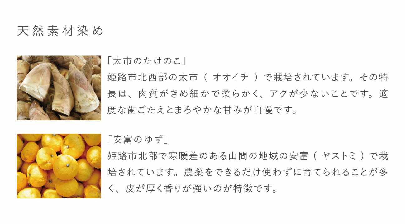 そのふたつの白を重ね、特産品である「ゆず」と「たけのこ」の皮で染めることで、姫路ならではの白をつくりました。