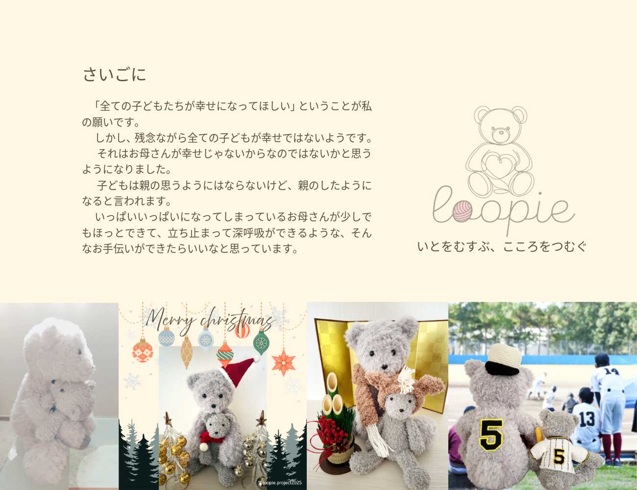 思わず触れたくなる、抱きしめたくなるあみぐるみという存在が親子のふれあいの時間へとつながってほしいと願っています。