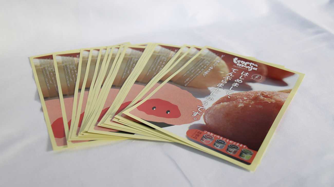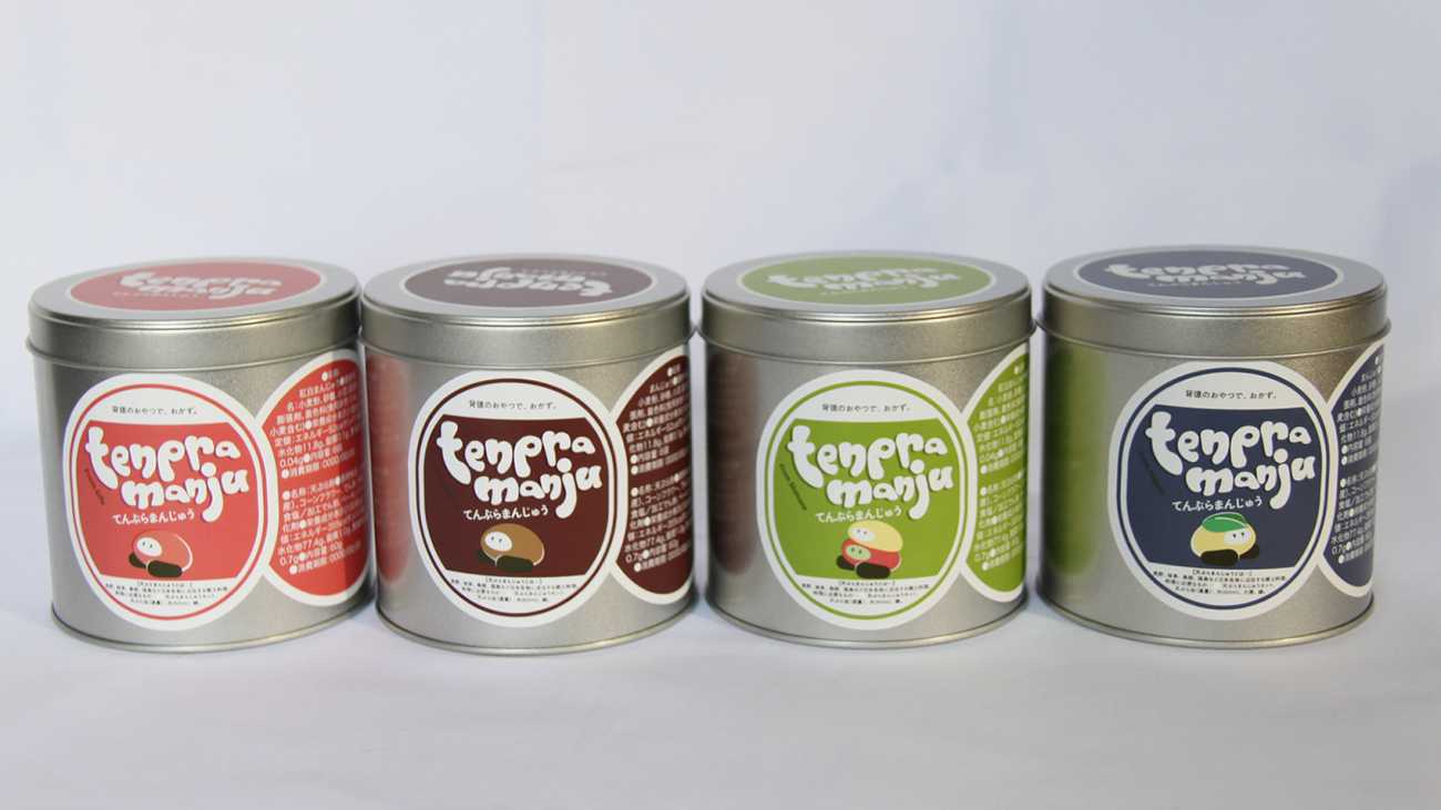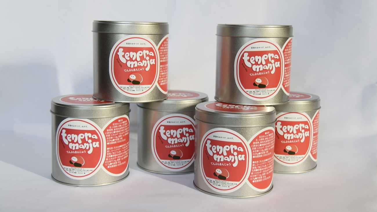 パッケージデザイン:缶にラベルを貼り作成、並べるとかわいいを大事にして作成している。この缶詰の中に、まんじゅうと天ぷら粉、説明書、マグネットが入る。