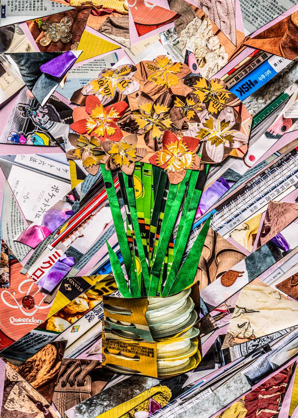 友人の物が1番多いお宅にお邪魔して、その人を象徴するモノの要素を切り取り、断片的に散りばめ、友人の外見からはわからない内側の部分を掬い上げ、花言葉に基づいた花としてコラージュ作品に落とし込みました。