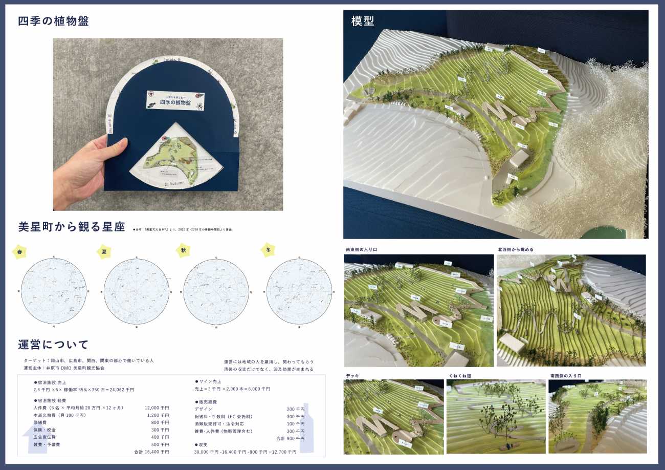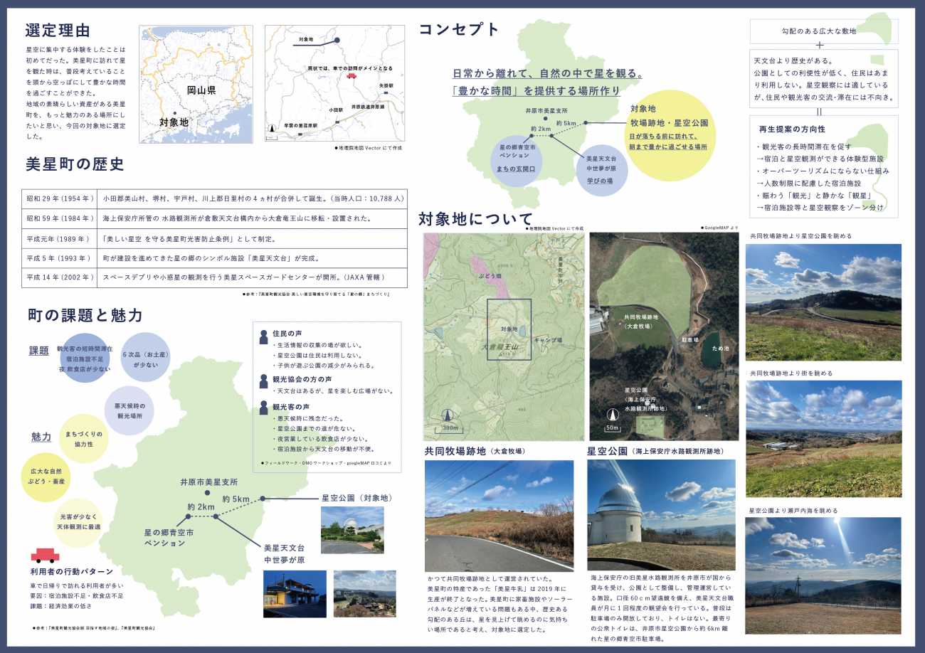 卒制では自分が深く関わったことのない地域を対象地にしたいと考え、地域に通い模索しながら制作を進めました。この制作に対する想いが、少しでも美星町の未来に繋がることを願っています。