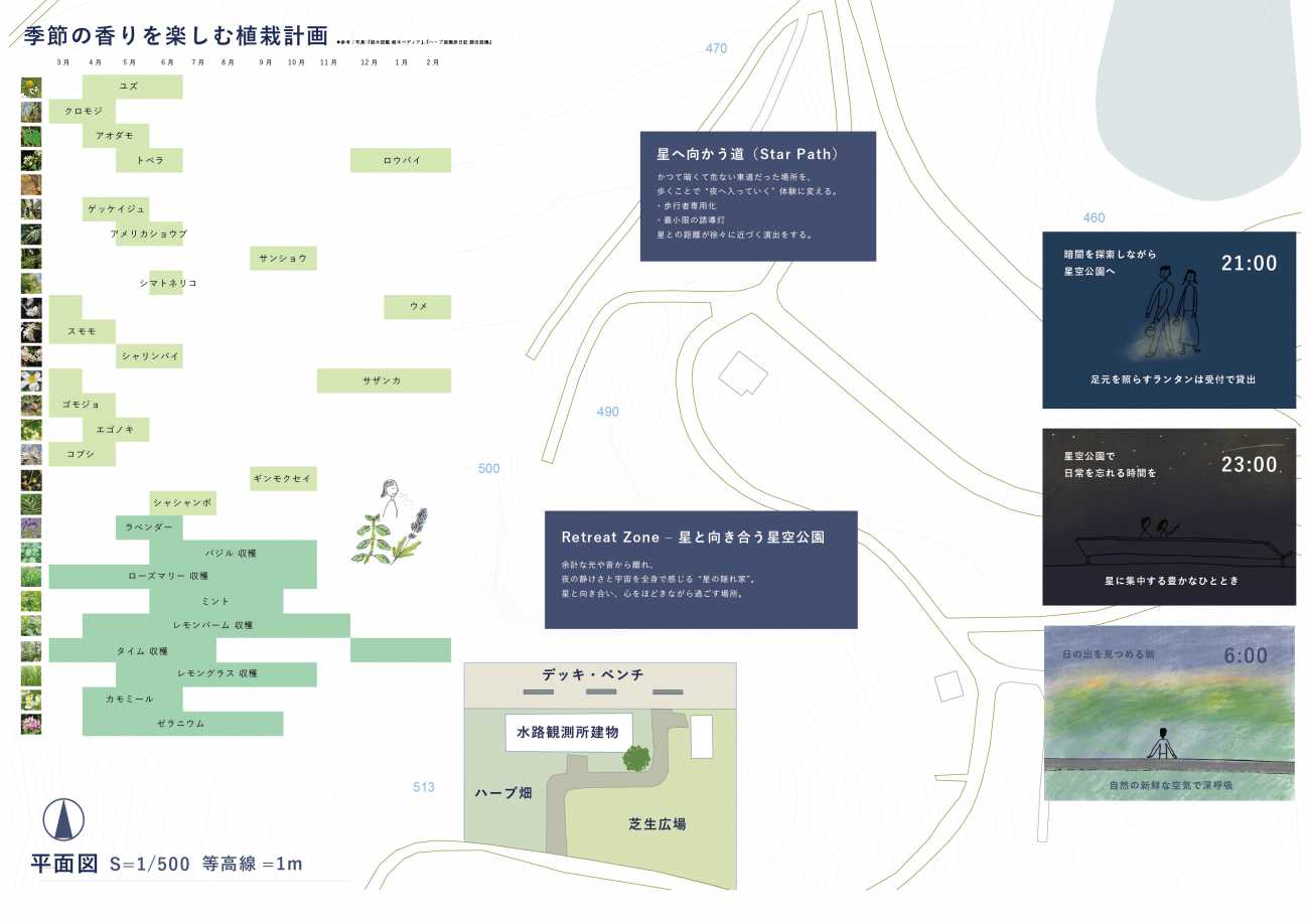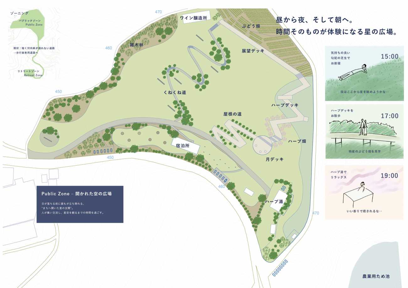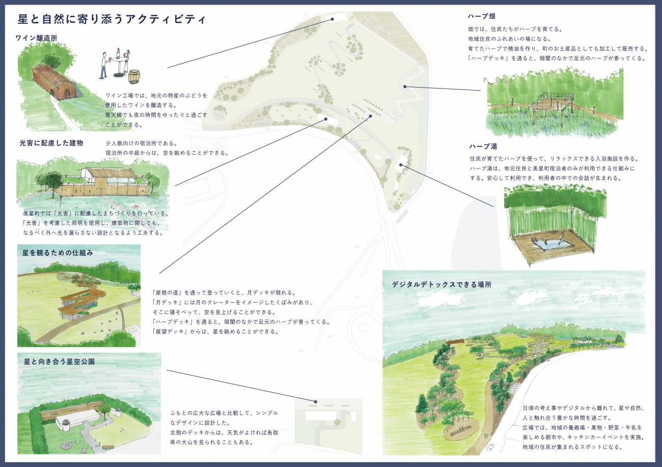 牧場の広大な敷地は人が集まる場所として、星空観測に向いた水路観測所は、星をゆったりと観る場所として、ゾーン分けして、設計しました。