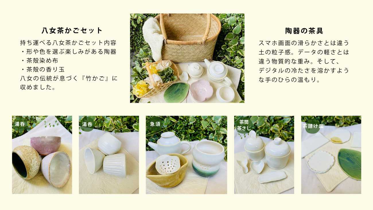 持ち運べる八女茶かごセット。形や色をその日の気分に応じて茶具を選ぶ楽しみもある陶器の茶具一式。 茶殻染めした布や茶殻の香り玉をセットにして八女の伝統が息づく『竹かご』に収めました。