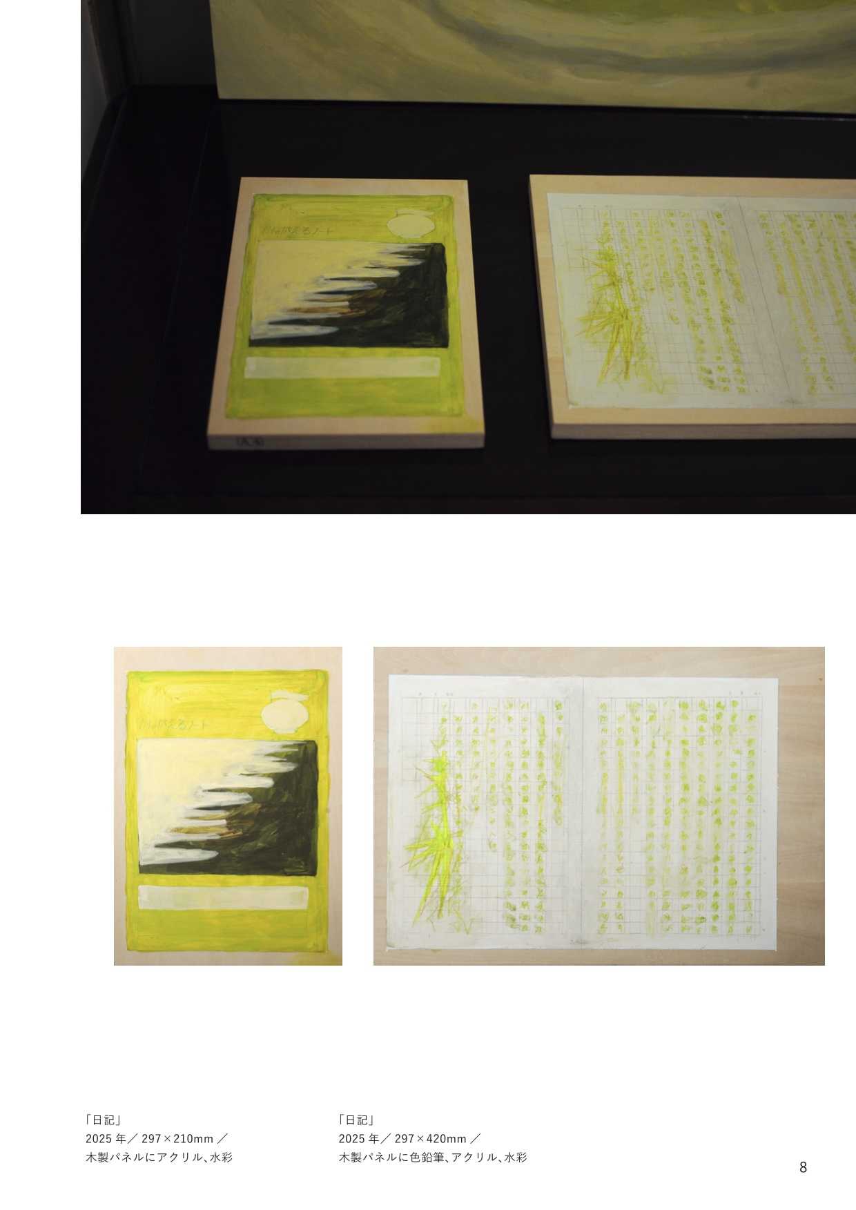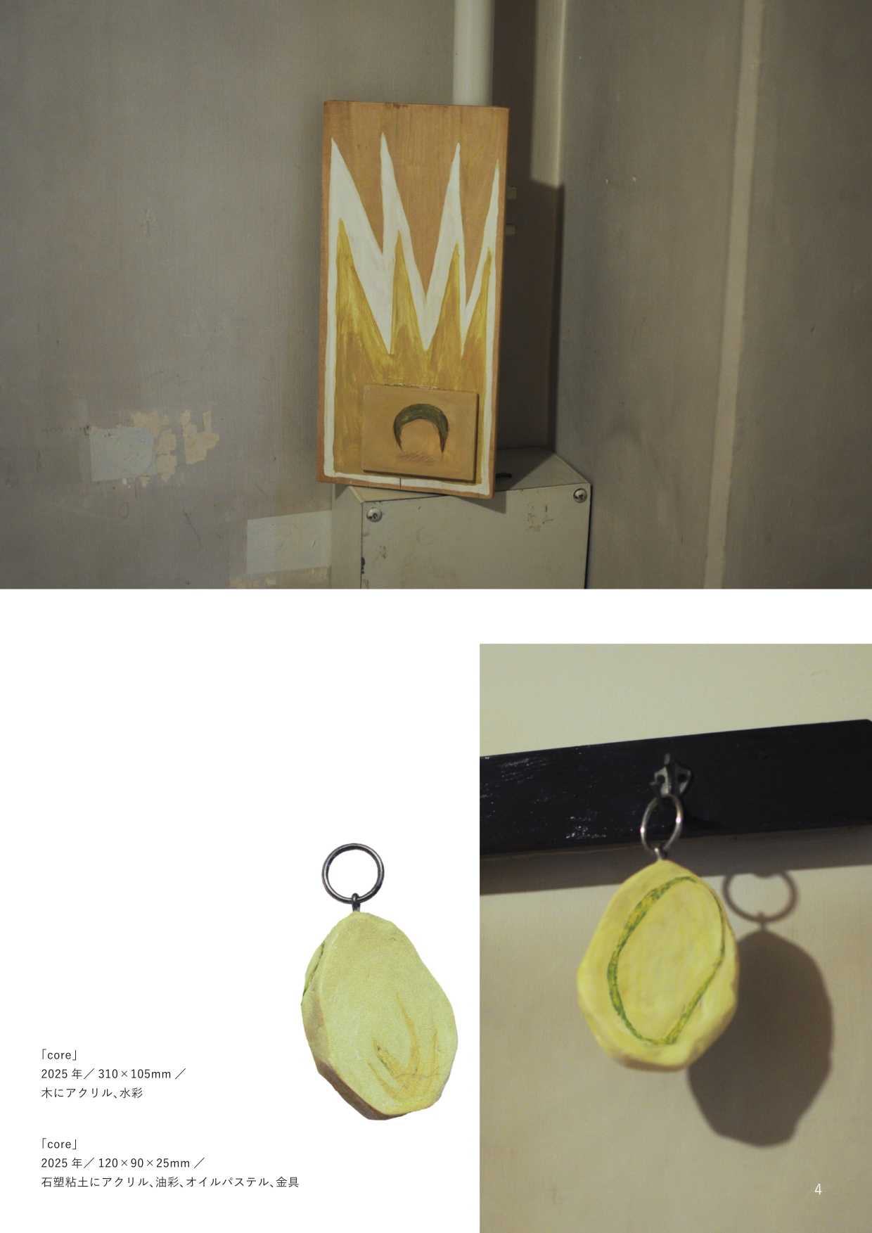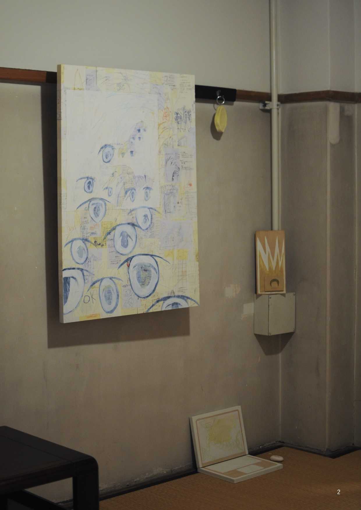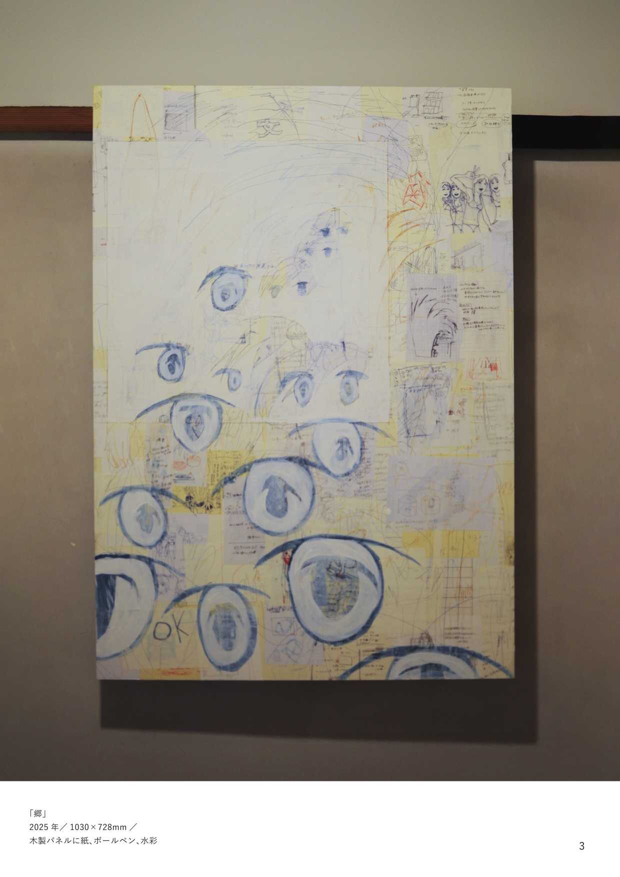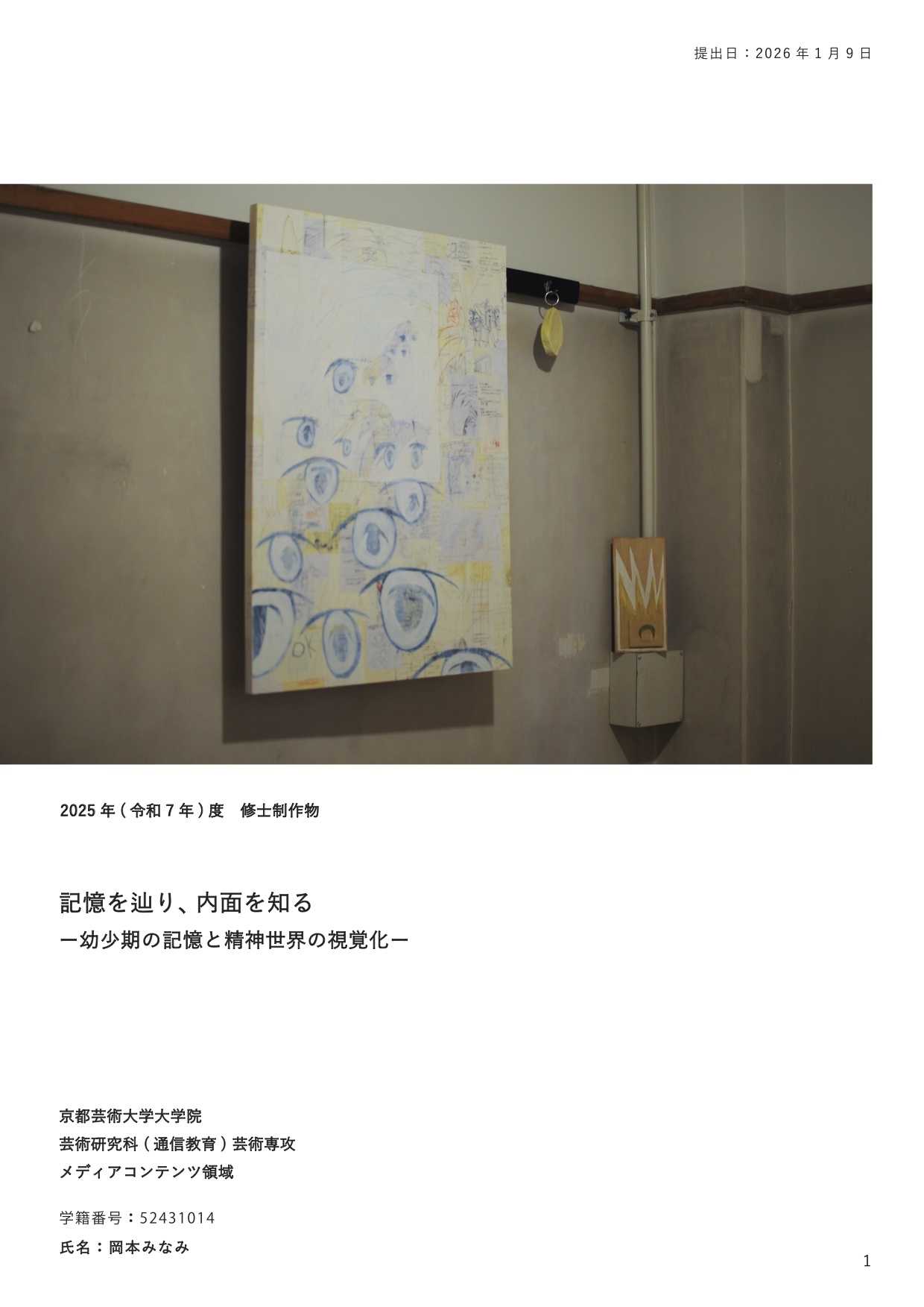 最終制作では、他者の視線から逃れる唯一の安息地であった「自室」をインスタレーションとして再現し、内面世界を物質化した。絵画制作においては、当時の苦痛を現在の感性で咀嚼し、抽象的な形態として定着させた。特に、無数のメモを画面に貼る「メモコラージュ」技法は、自己の保持と現実逃避がせめぎ合う精神構造の視覚化である。作品群には、肉体から逸脱する視線を描いた『郷』や、幸福な記憶の象徴である学習ノートに現在の苦悩を記述し直した『日記』、デジタルへの没入と身体の停滞を表した『core(核)』が含まれる。