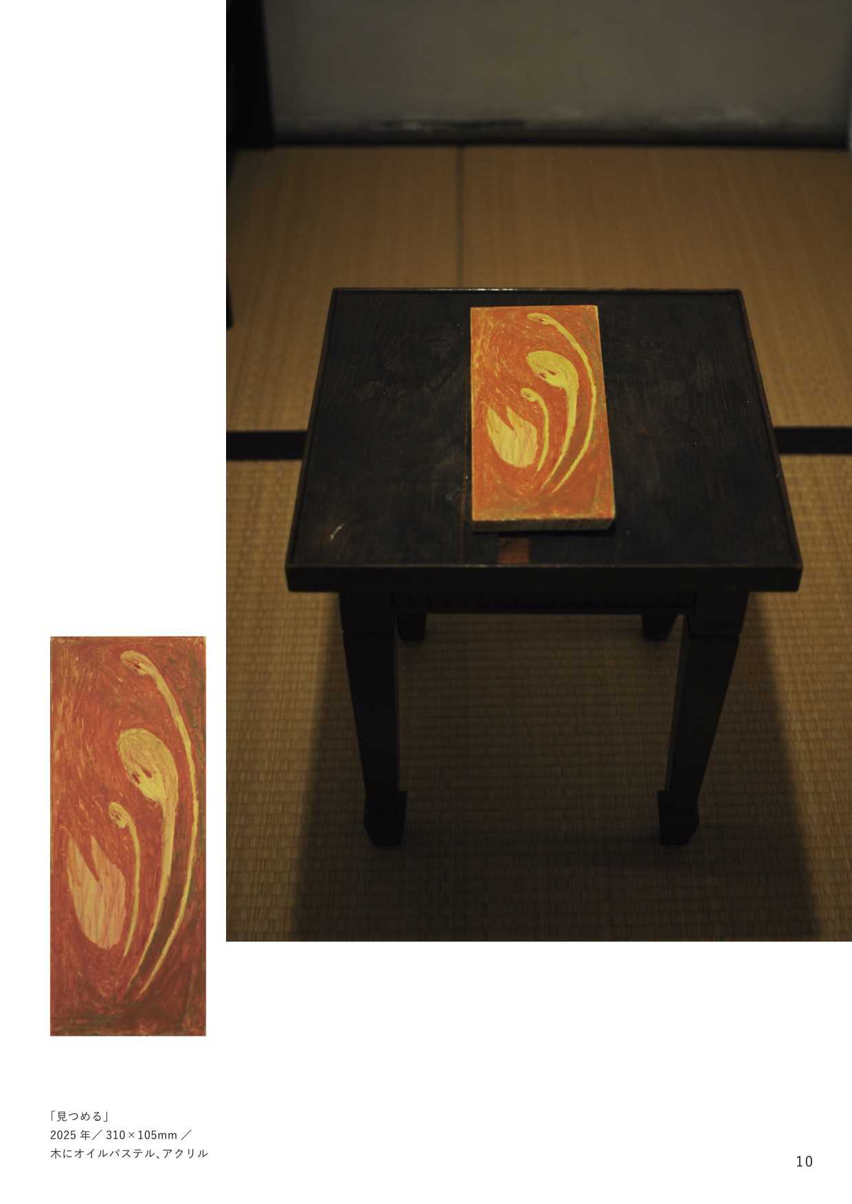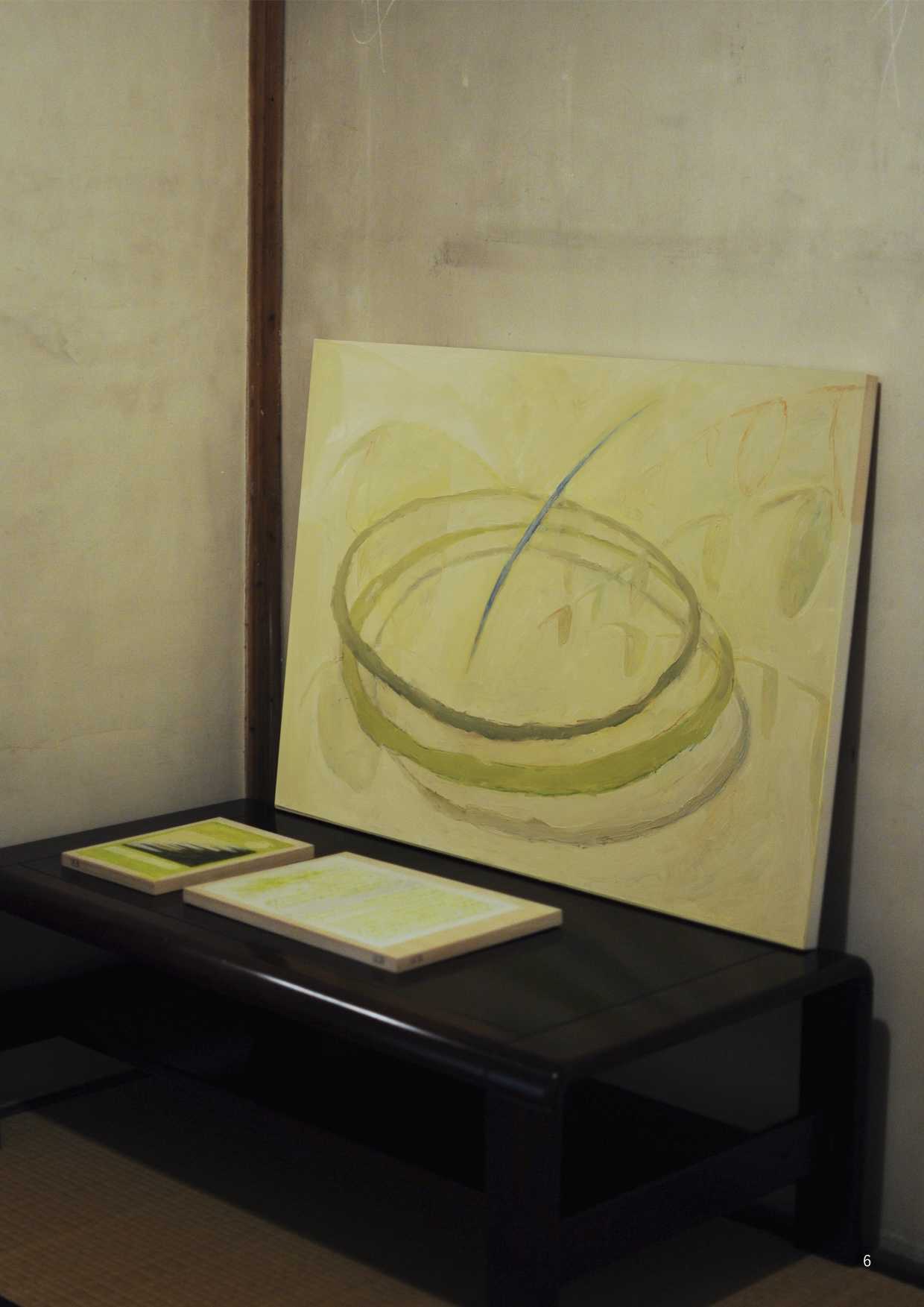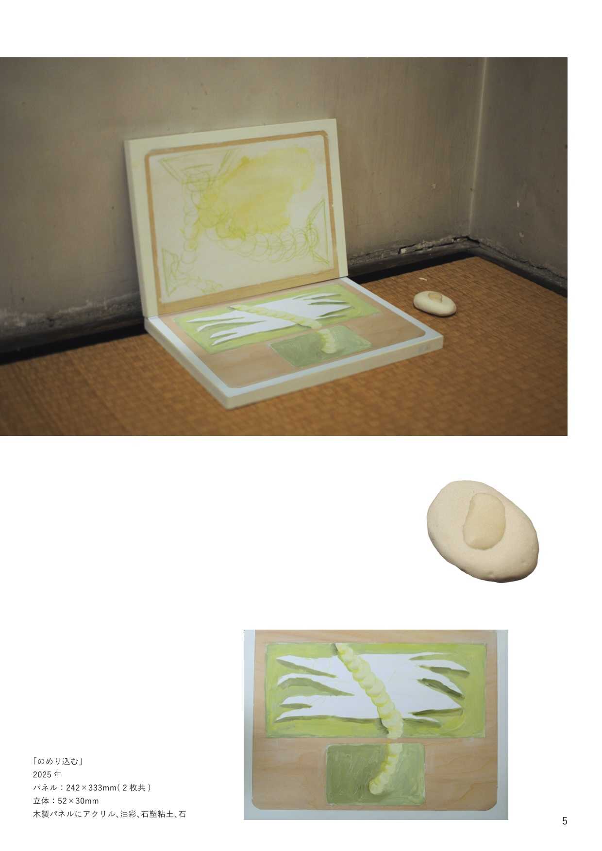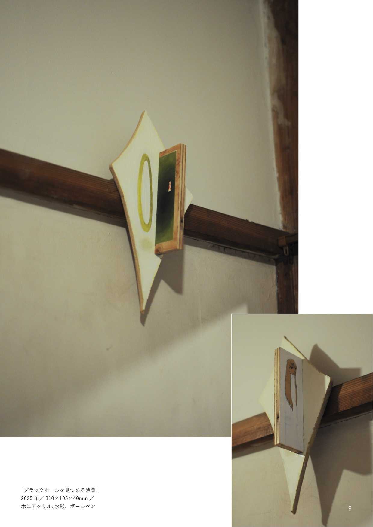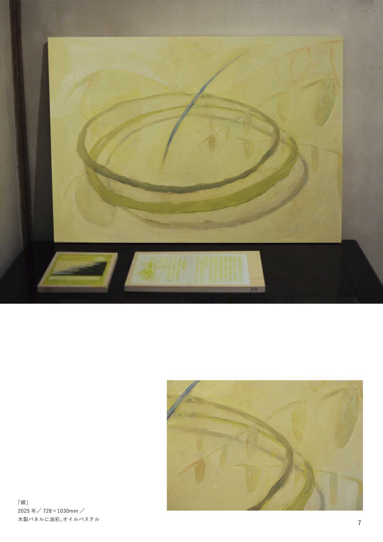 最終制作では、他者の視線から逃れる唯一の安息地であった「自室」をインスタレーションとして再現し、内面世界を物質化した。絵画制作においては、当時の苦痛を現在の感性で咀嚼し、抽象的な形態として定着させた。特に、無数のメモを画面に貼る「メモコラージュ」技法は、自己の保持と現実逃避がせめぎ合う精神構造の視覚化である。作品群には、肉体から逸脱する視線を描いた『郷』や、幸福な記憶の象徴である学習ノートに現在の苦悩を記述し直した『日記』、デジタルへの没入と身体の停滞を表した『core(核)』が含まれる。