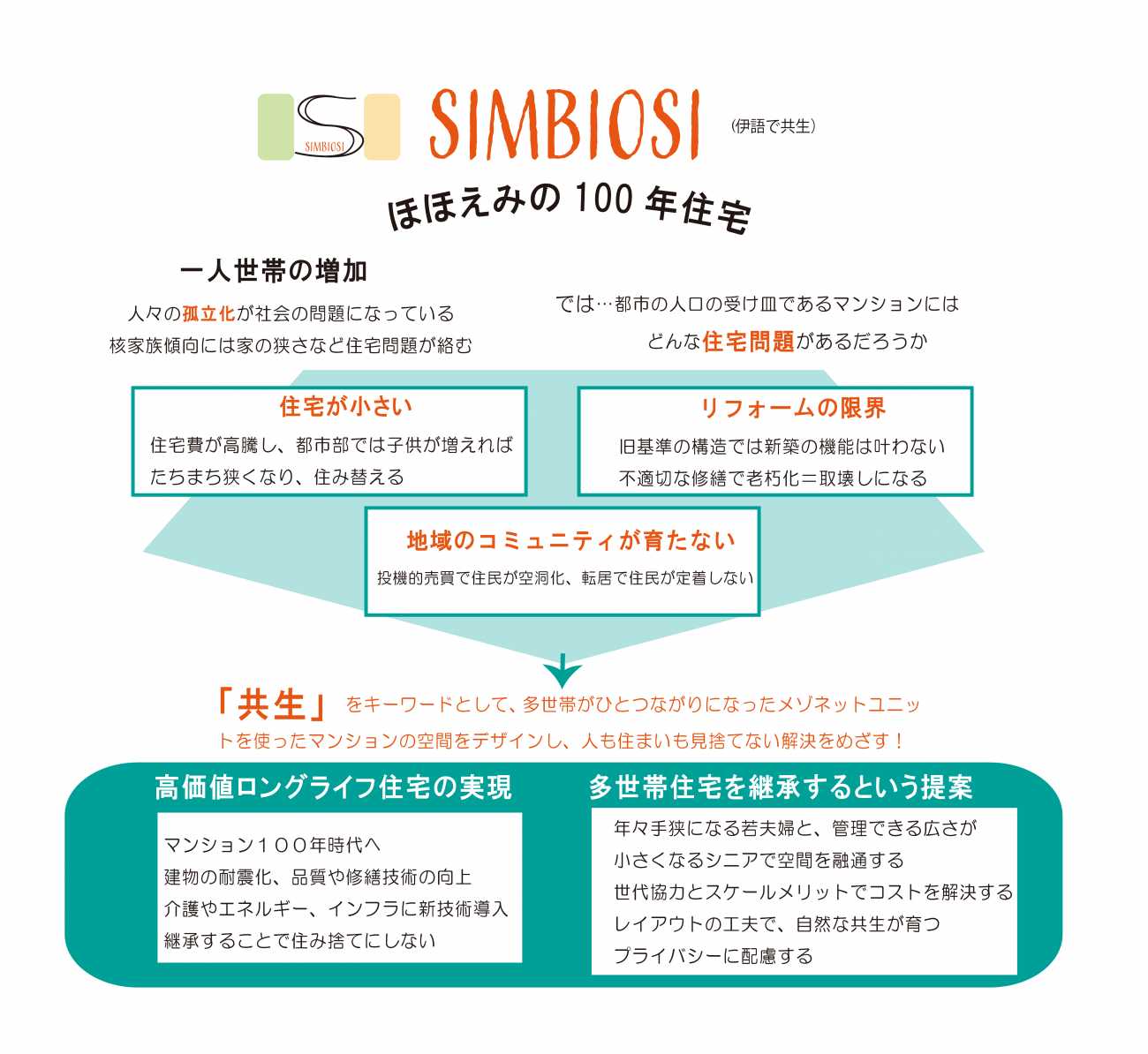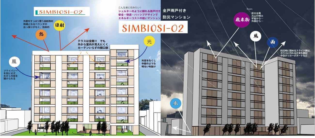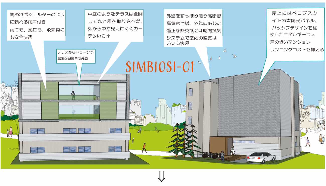 Simbiosiのマンションが増えて、大家族での暮らしが広がり、スケールメリットで防災やライフラインの自立などの設備が充実し、エネルギー自給自足時代が到来する。住宅を未来的生活の場のためのデザインに!