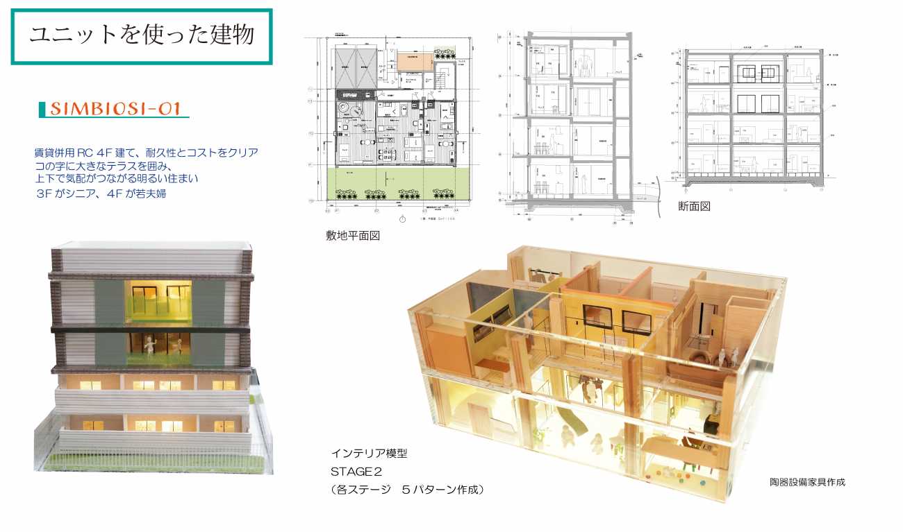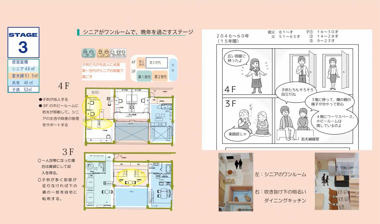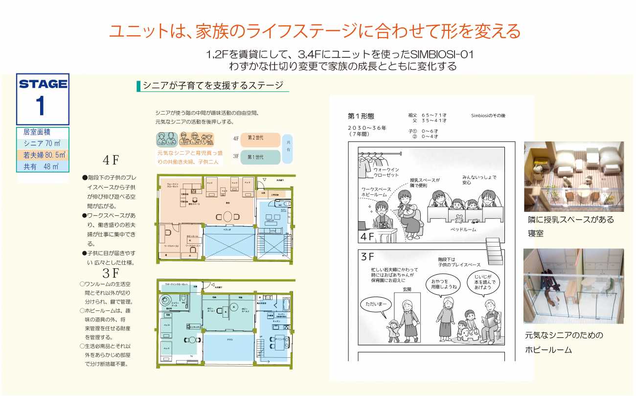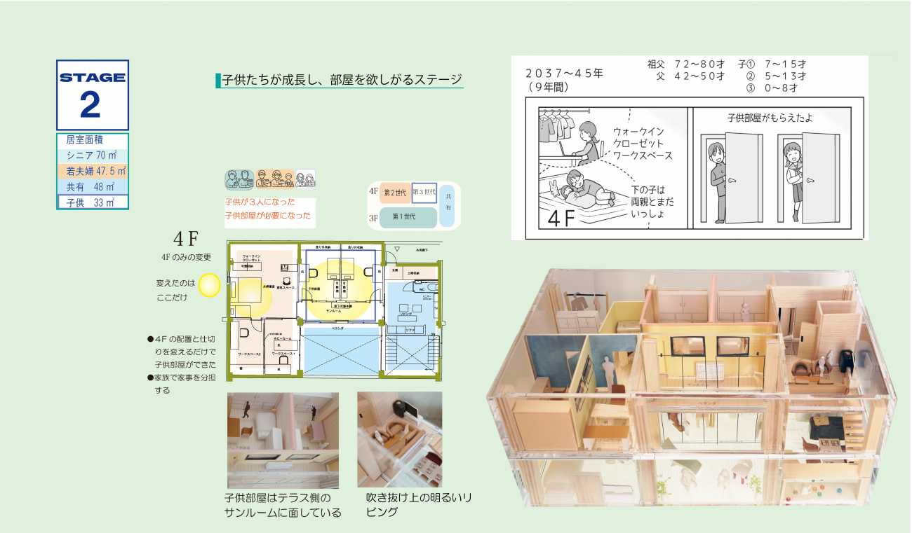 目指す未来の住宅は「多世帯で継承するメゾネットユニット」で構成され「多世帯が上下に住み分けながら、ストレスなくひとつながりになる」という特徴を持ちます。