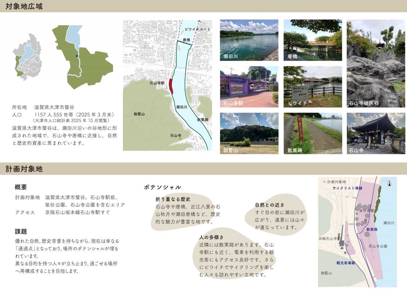 滋賀県大津市、瀬田川沿いに位置する石山寺駅周辺は、豊かな自然や歴史的資源に囲まれ、多様な人の動きが集まる場所です。しかし実際には、多くの人が目的地へ向かう途中に通り過ぎる場となり、地域が持つ魅力が十分に現れていないように感じられました。