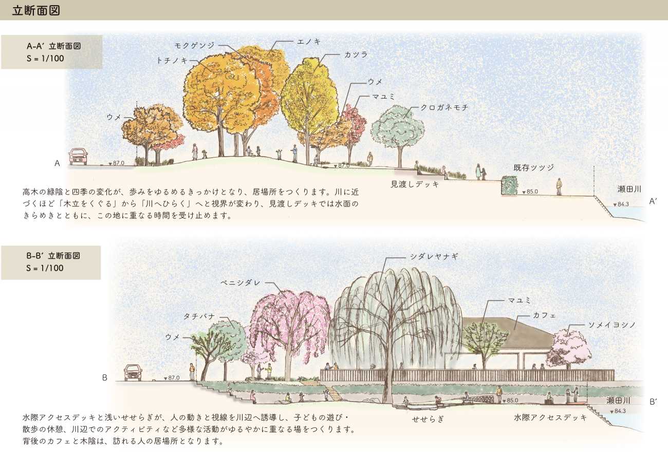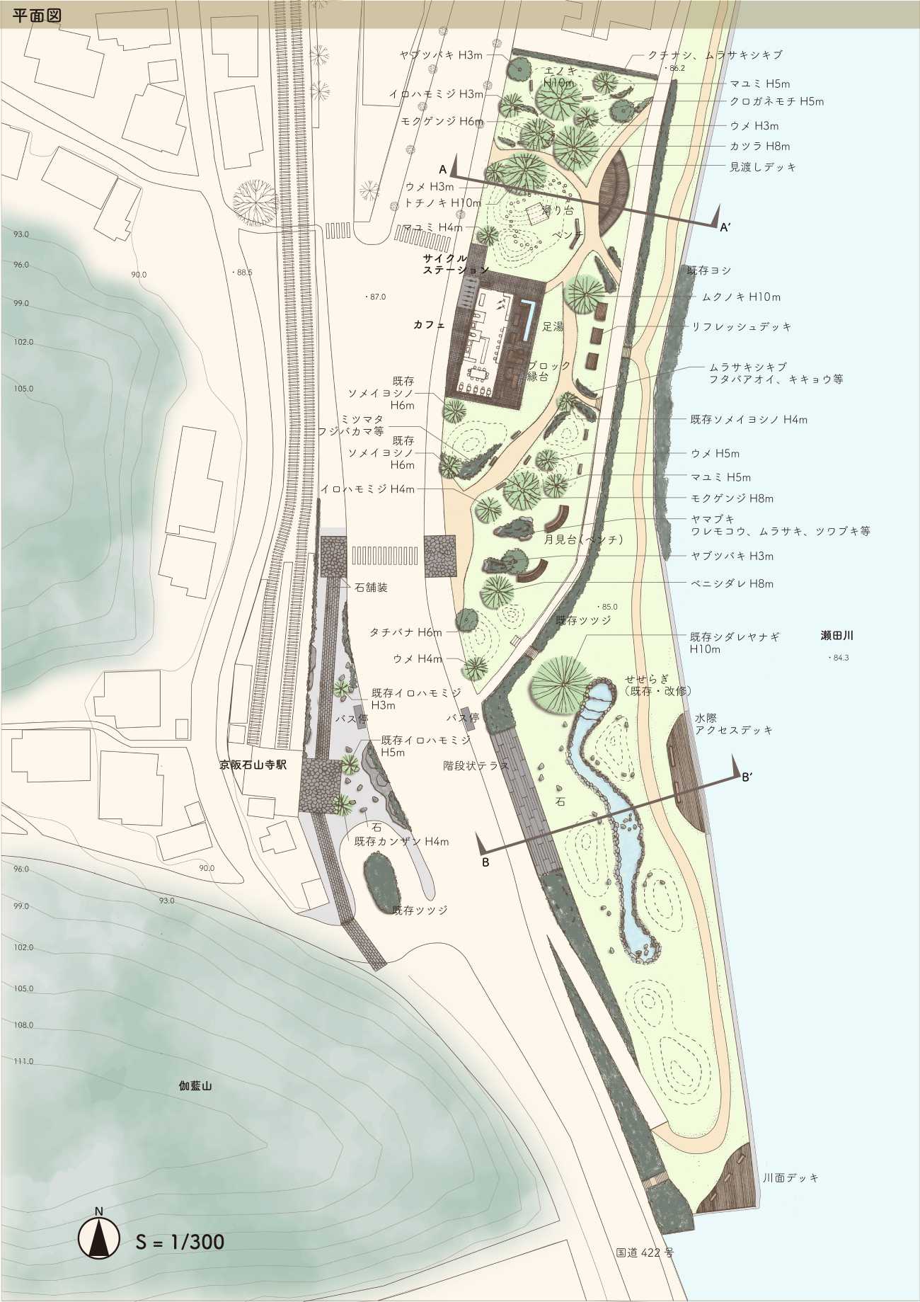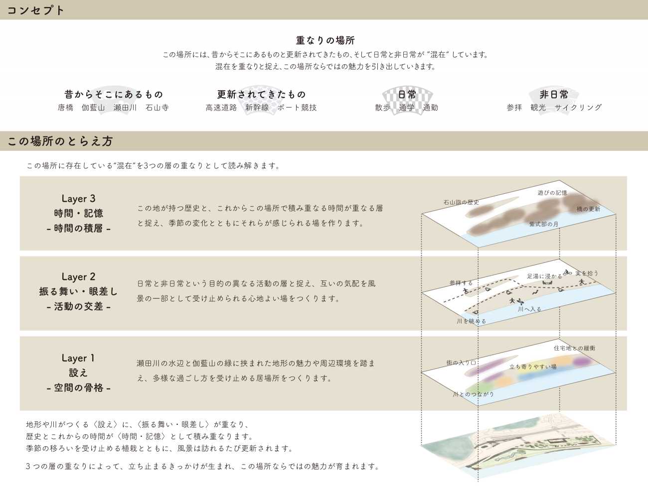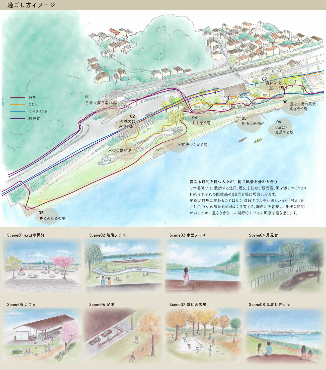 特別な目的がなくても自然に立ち止まり、瀬田川を背景にして、それぞれの時間が静かに重なっていく―――そんな水辺のランドスケープを提案しています。