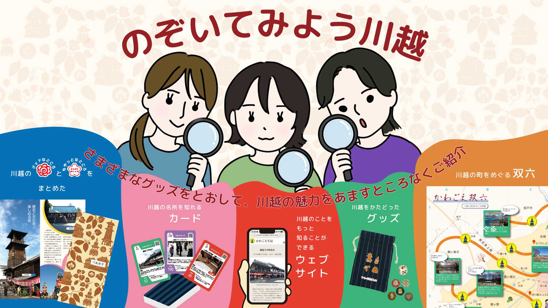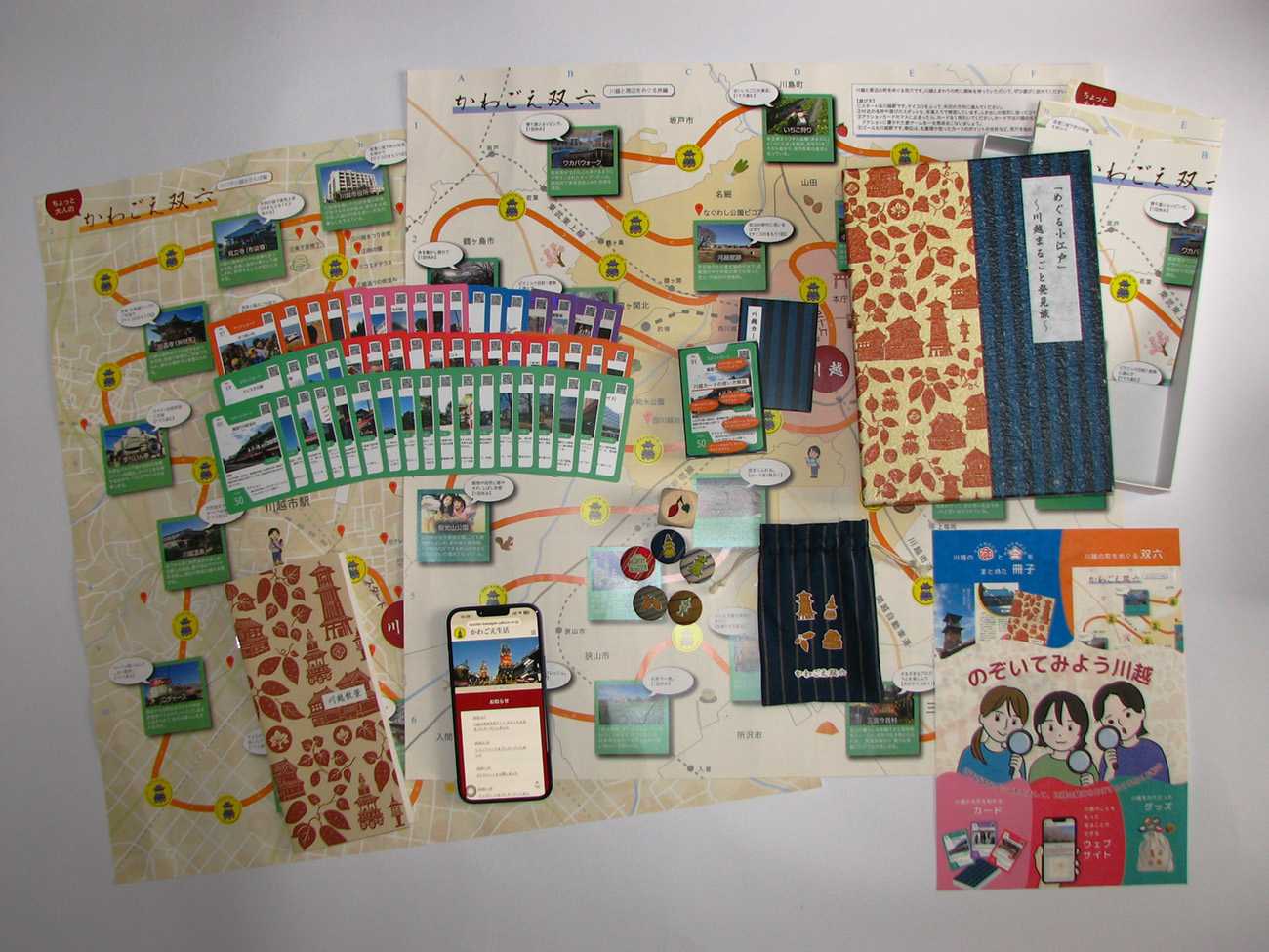 川越を舞台にした双六を中心に、トレーディングカード、冊子、ウェブサイトを活用して、川越の魅力を紹介しています。それぞれのグッズは単独でも利用できますが、組み合わせて活用することで、より効果を発揮します。
