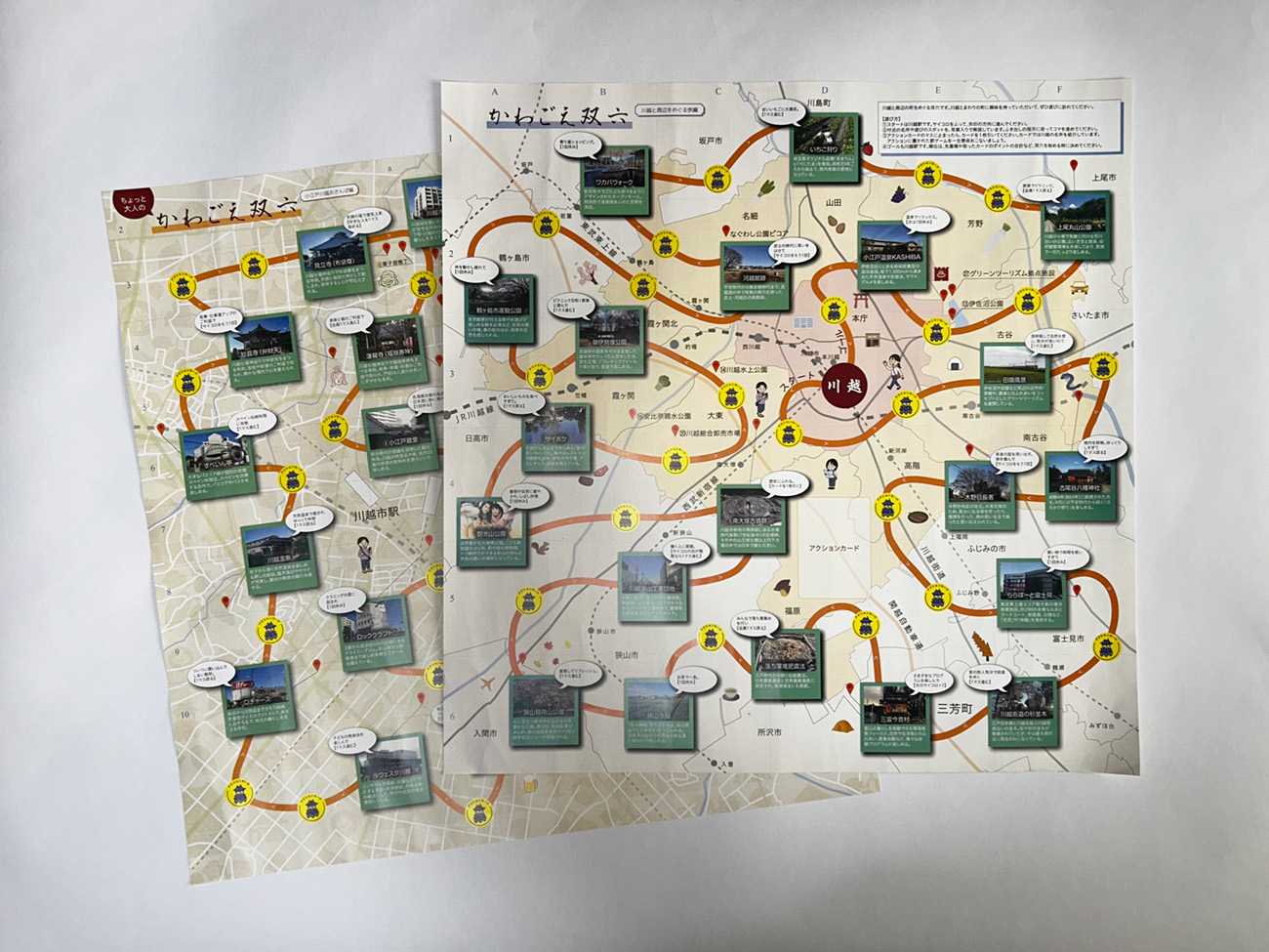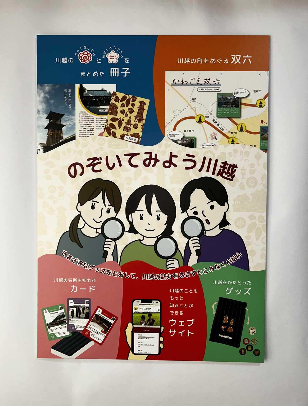 冊子は、左開きにグッドなところ、右開きにもやっとなところを両面表紙で記載して、川越を余すところなく紹介。カードホルダーを搭載していて、双六で取ったカードを差して、まち歩きに出かけられます。