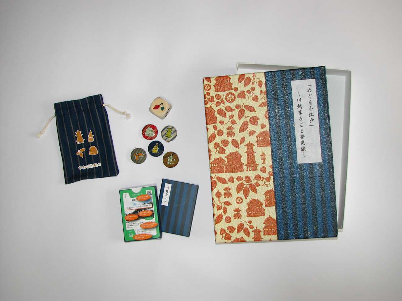 グッズは、川越の郷土の特産品や名所のアイコンを使って、川越を宣伝しています。双六コマや小袋は川越唐桟を使い、サイコロは一の目をさつまいものイラストにしています。