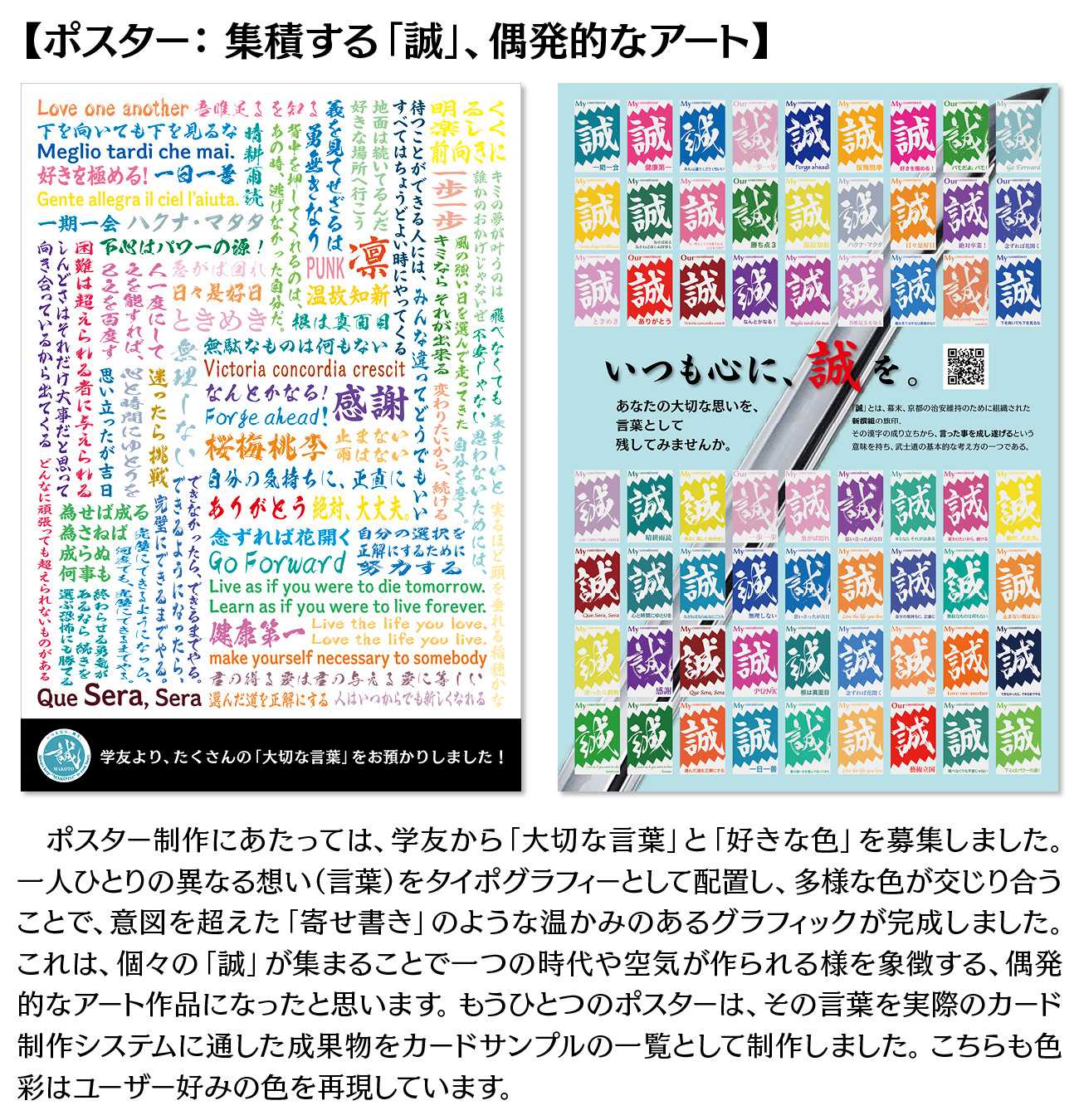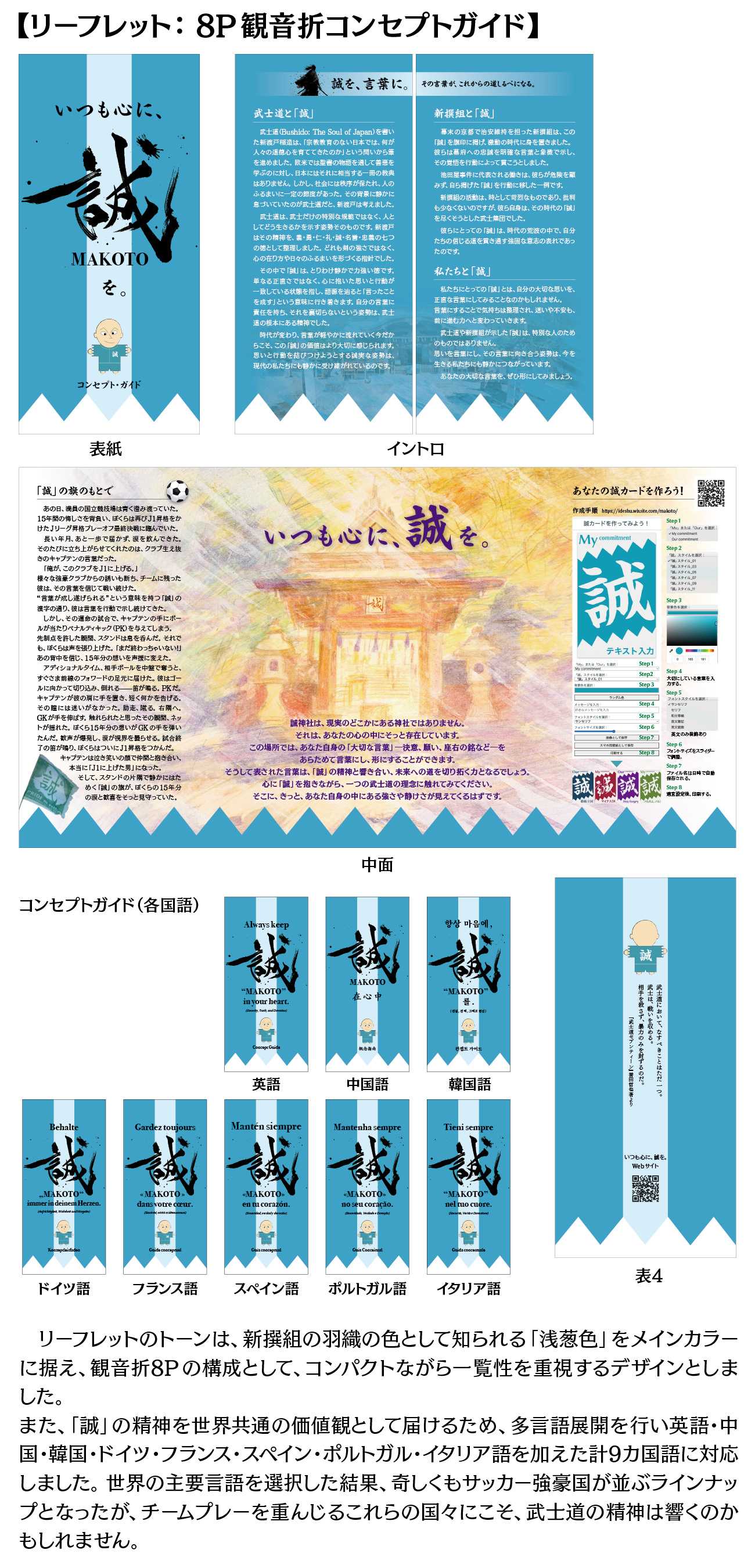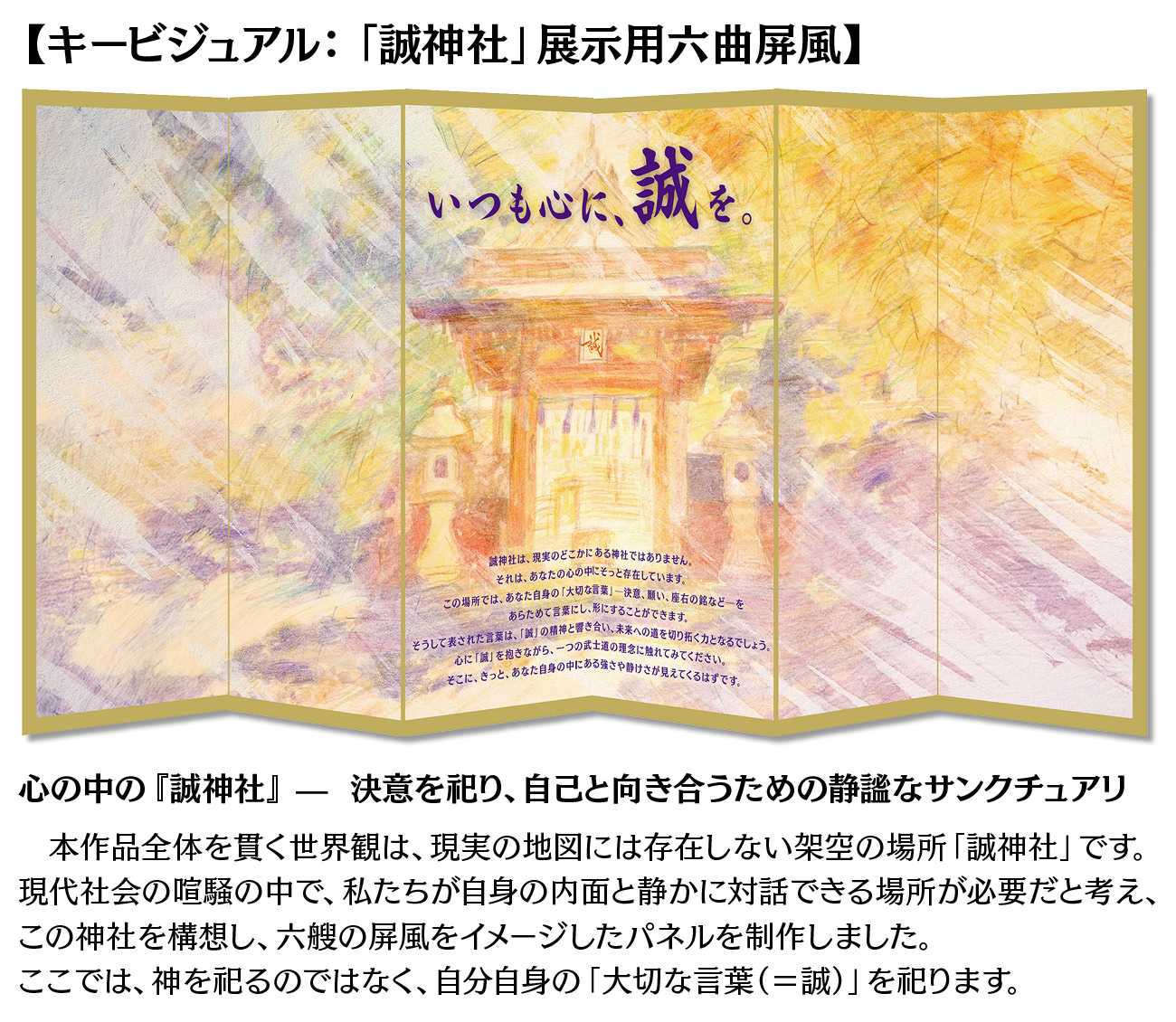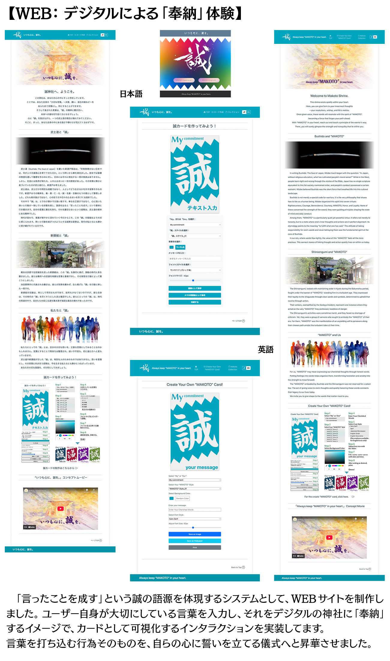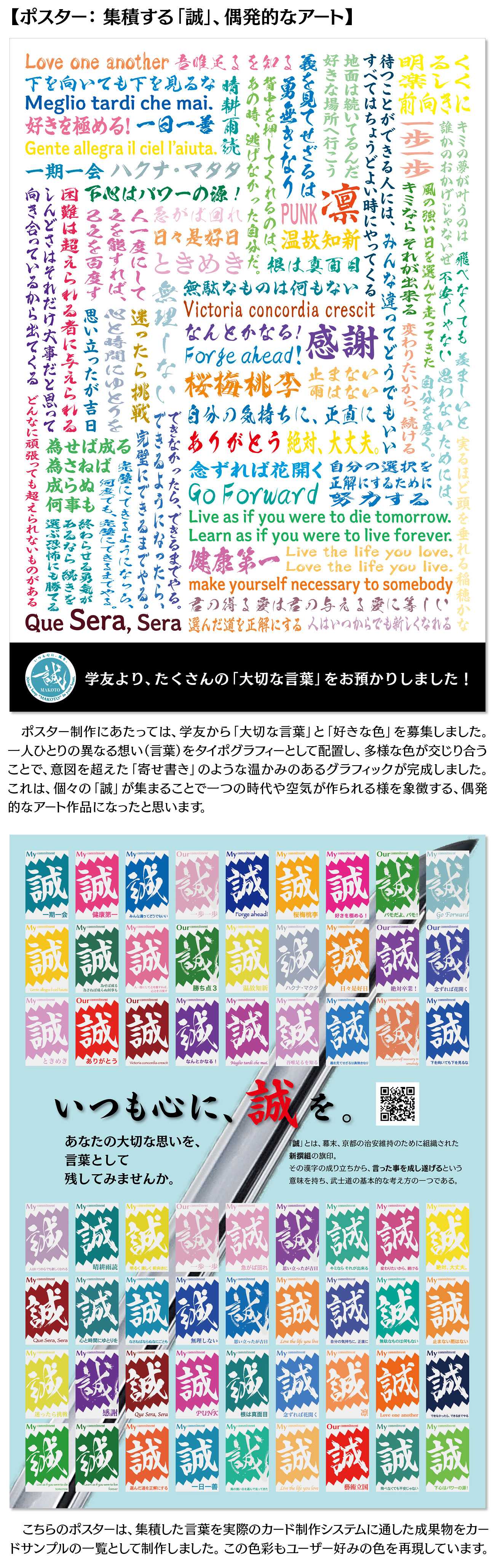 本作品は、新渡戸稲造が説いた武士道の徳目の一つであり、新撰組が旗印として掲げた「誠」の精神に着目し、これを現代人が抱える精神的課題への「道しるべ」として再構築する試みです。「言ったことを成す」という誠の語源に基づき、個人の内にある「大切な言葉」を可視化・行動化するデザインシステム(リーフレット、ポスター、WEBサービス、映像)を制作しました。これらの作品を通じて、歴史的遺産としての武士道を、現代を生きる私たちの心の支えとして昇華させることを目的としています。