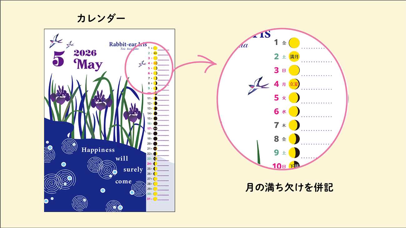 かつて旧暦が使われていた時代、人々は月の満ち欠けを道しるべに、ゆったりと時を刻んでいました。 このカレンダーに月相(月の満ち欠け)を載せたのは、私たちがいつの間にか忘れてしまった「自然とともに流れる時間」を、もう一度見える形にしたかったからです。