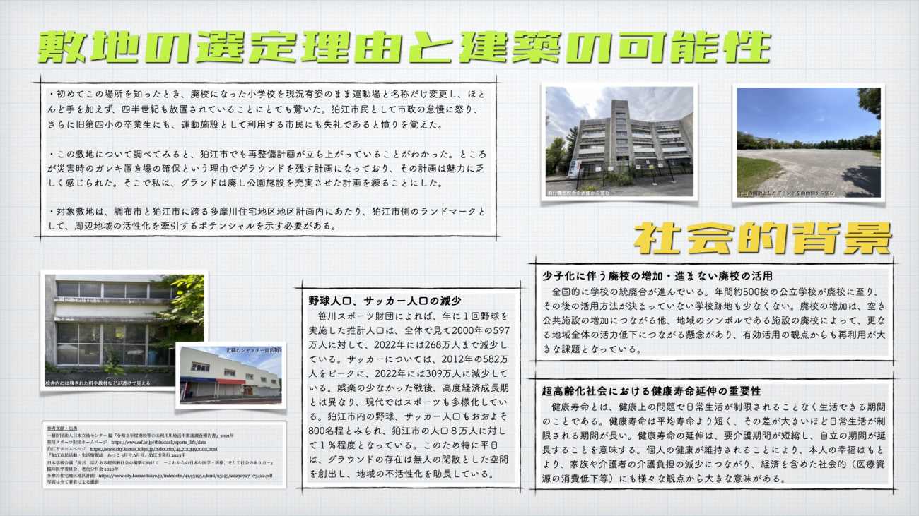 HOME 建築デザインコース 遊環プロムナードスポーツパーク 遊環プロムナードスポーツパーク 運動しない人も気軽に立ち寄れる運動施設 建築デザインコース 小柳出卓也 CLOSE Tag #建築 #回遊 #模型 小柳出卓也 建築デザインコース Share Xでシェアする LINEでシェアする このコースのその他作品 建築デザインコース 2025年度作品 作者肥田木早紀子 建築デザインコース 2025年度作品 作者小川 恵丈 建築デザインコース 2025年度作品 作者三浦 理紗子 建築デザインコース 2025年度作品 作者松田 仁史 建築デザインコース 2025年度作品 作者跡部久未子 建築デザインコース 2025年度作品 作者石橋優希 建築デザインコース 2025年度作品 作者坂口祐香 建築デザインコース 2025年度作品 作者瓜生 悠里 建築デザインコース 2025年度作品 作者村上 暖 建築デザインコース 2025年度作品 作者山﨑悠平