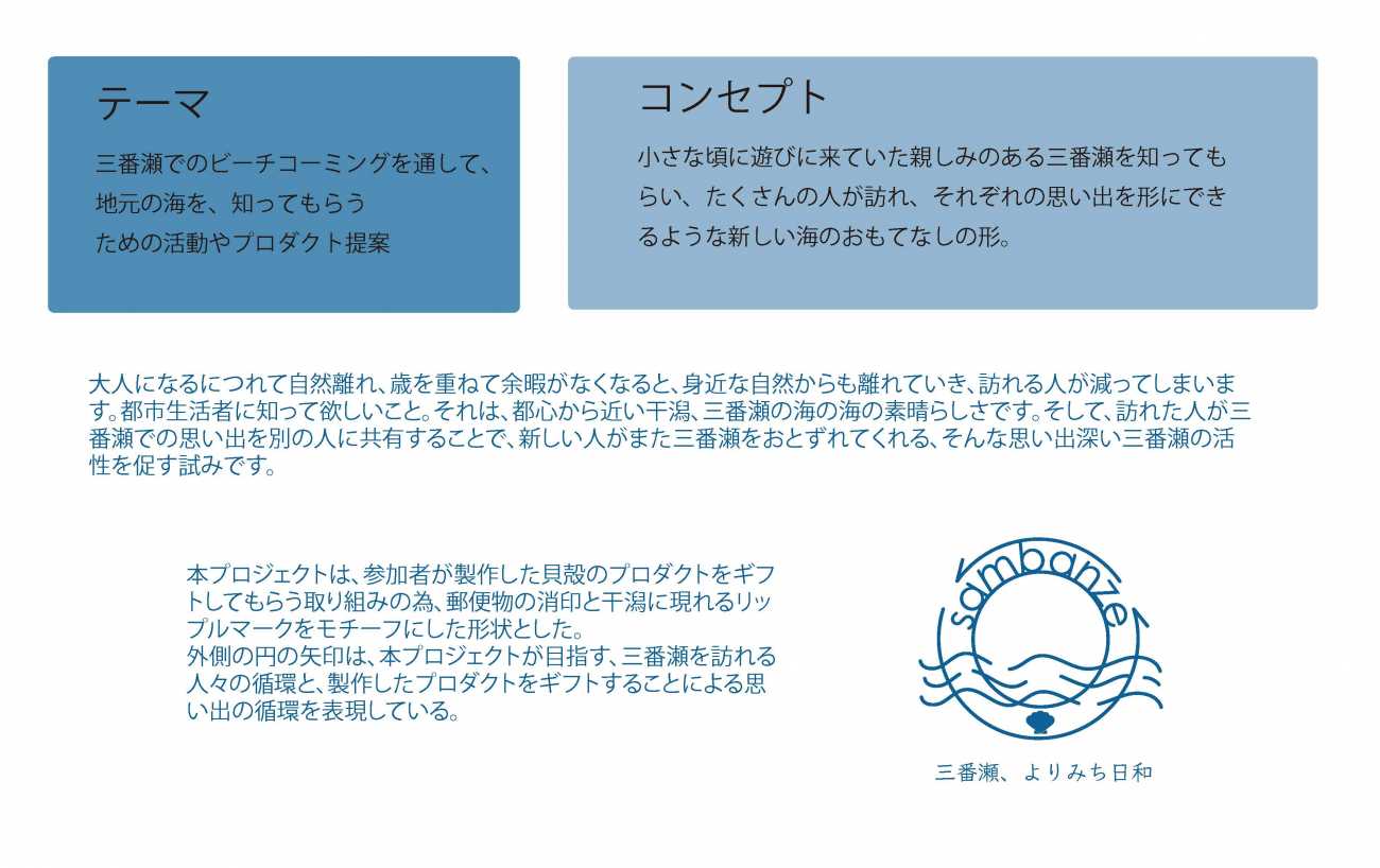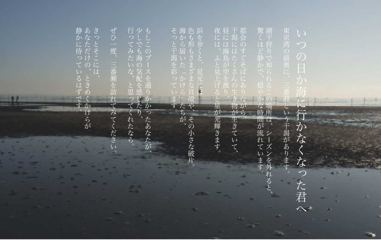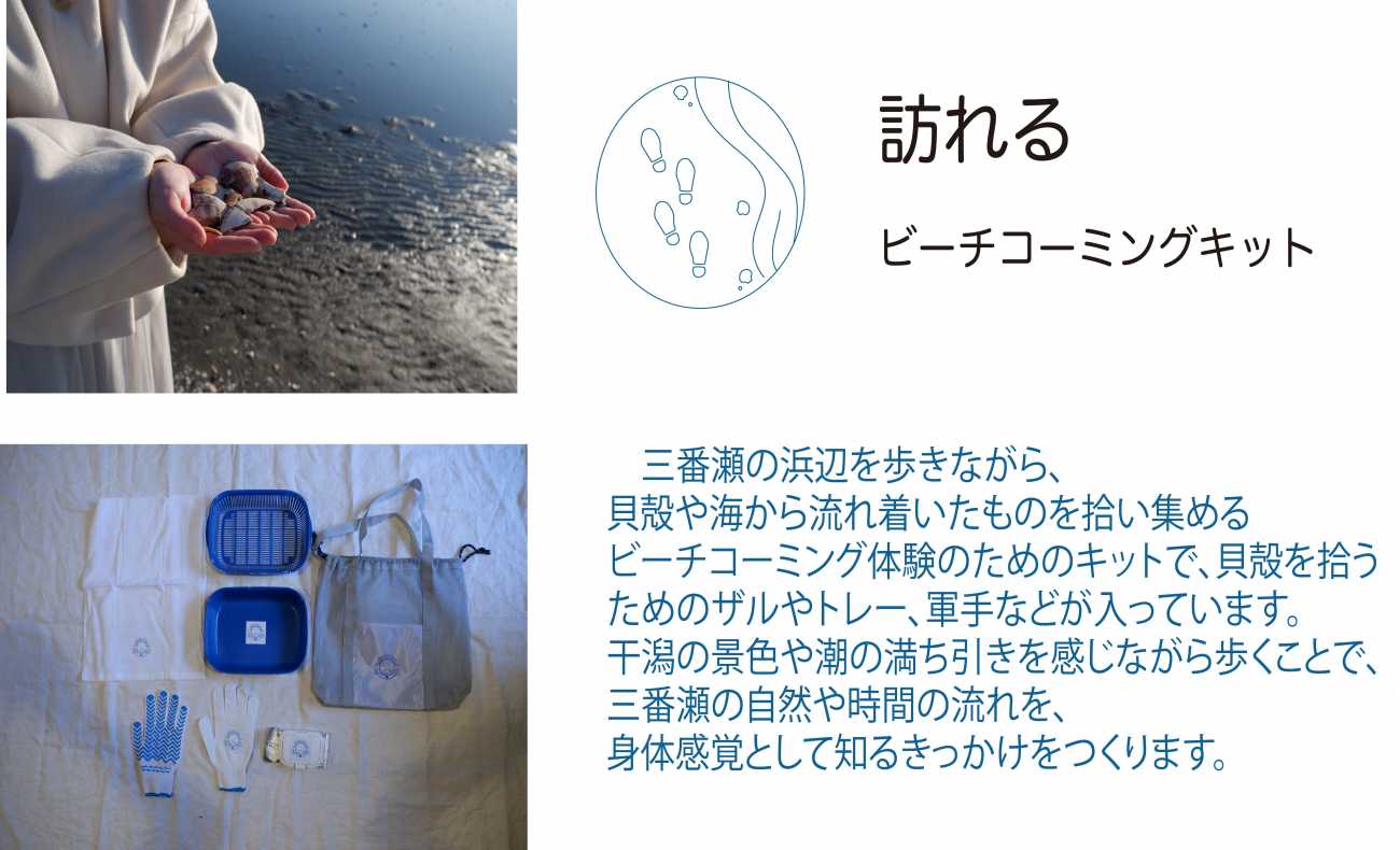 本作品は、東京湾の最奥に位置する三番瀬干潟を舞台に、ビーチコーミングとギフト制作を通して地元の海を知ってもらうための活動とプロダクトの提案です。