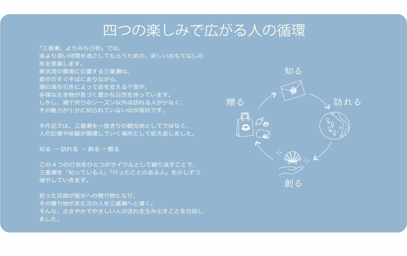 「三番瀬、よりみち日和」は、海へ少し寄り道することから始まる、海よりも深い時間の提案です。都市の中にある干潟を、思い出とともに受け渡していく、新しいおもてなしのかたちを提示します。