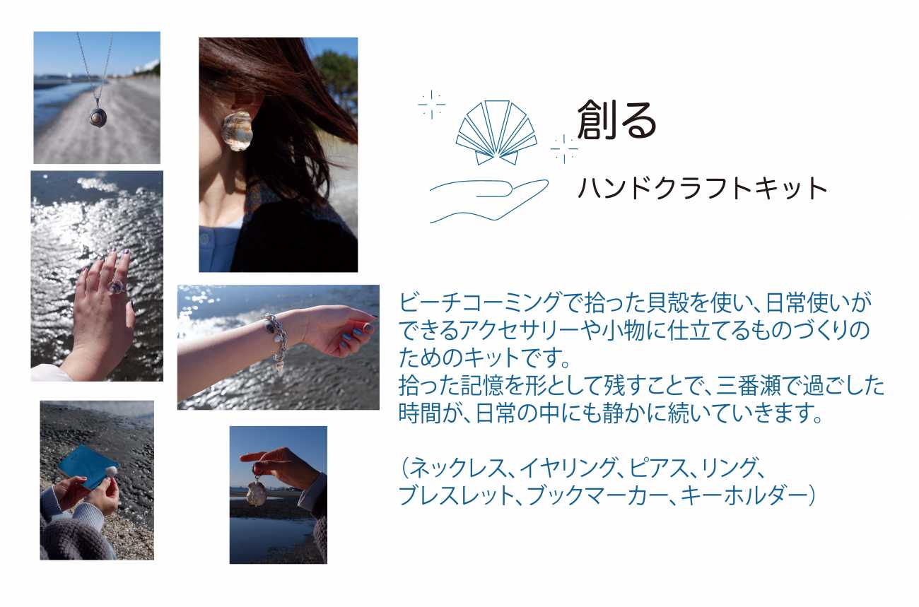 その仕組みが、「知る・訪れる・作る・贈る」というサイクルです。SNSやパンフレットで三番瀬を知り、実際に干潟を訪れる。浜辺を歩きながら貝殻や漂着物を拾うビーチコーミングを体験し、持ち帰った素材をハンドクラフトキットでアクセサリーや雑貨へと仕立てます。