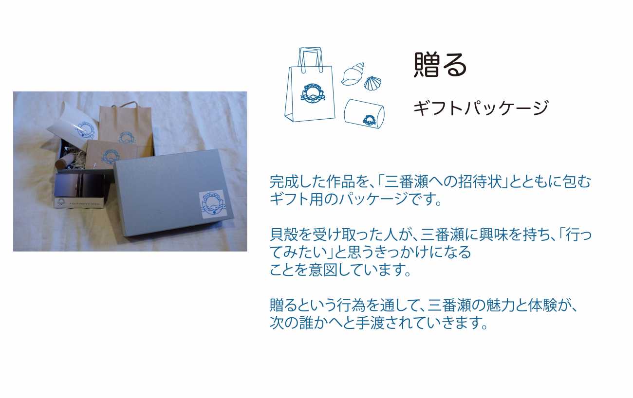拾った貝殻が日常で使えるかたちになることで、三番瀬で過ごした時間は単なる記憶ではなく、触れられる存在として残り続けます。さらに完成した作品は、オリジナルのギフトパッケージに包み、「三番瀬への招待状」を添えて大切な人へ贈ります。