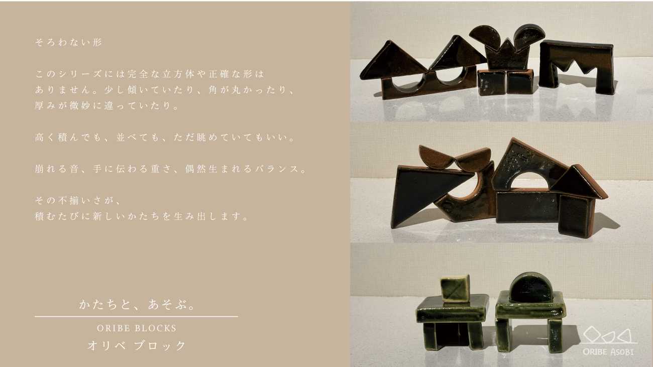 「ORIBE ASOBI」シリーズは、こうした織部の自由でのびやかな精神性( オリベイズム) をプロダクトに広げ、“ 眺めるだけの工芸品”ではなく、手で触れたり、遊んだりしながら“ 使うたびに楽しい” という体験として届けることを目指しています。