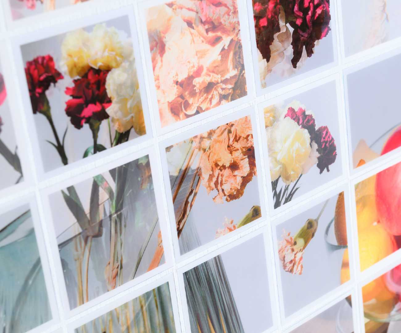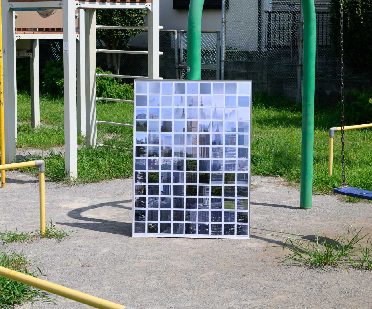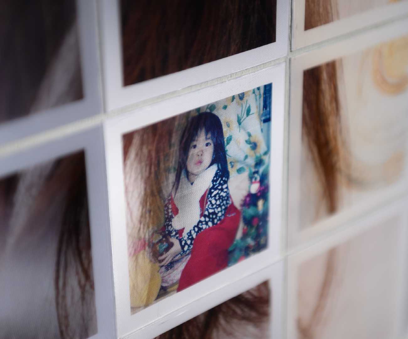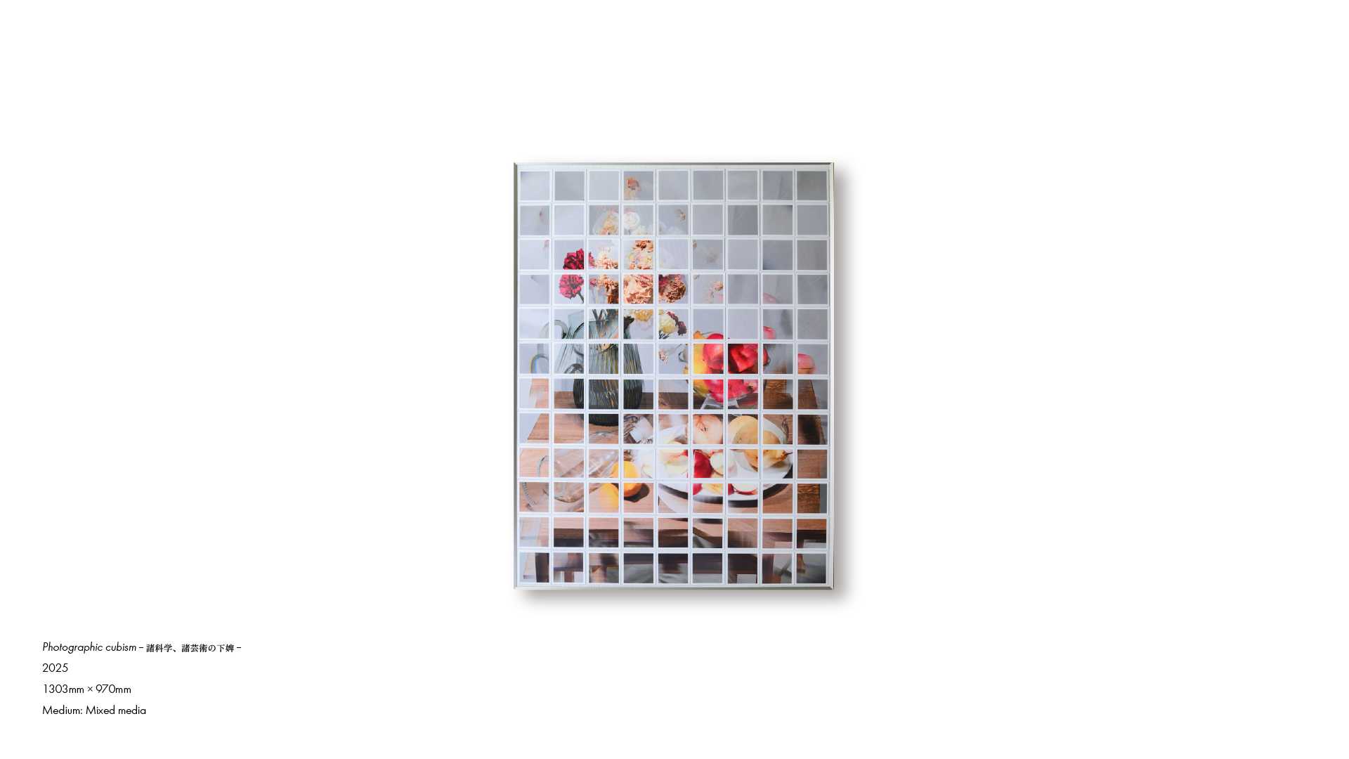 本シリーズは、レンチキュラーレンズとプリズムフィルターという二つの光学技術を用い、写真における多視点的表現と時間の積層を試みた作品群です。ポートレート、静物、風景の三つの主題で展開される本作は、100mm角の正方形に分割された100〜200枚の写真群を、木製パネル上でグリッド状に再構成することで成立しています。