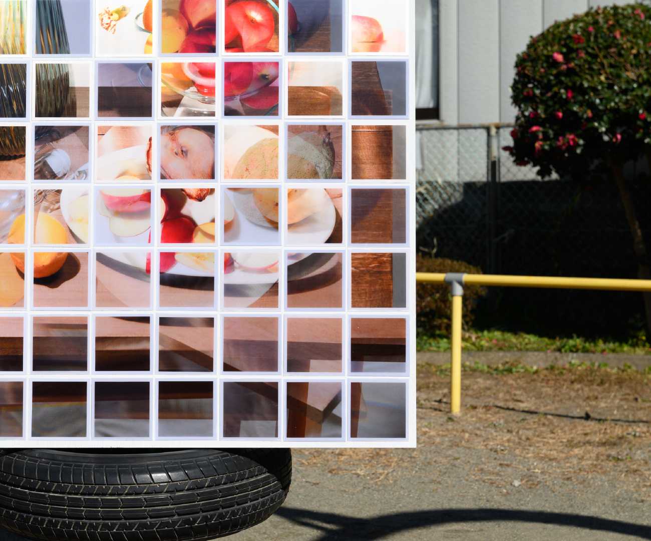 本作の構造における最大の特徴は、鑑賞者の身体的な移動に連動してイメージそのものが物理的に揺らぎ続ける点にあります。表面を覆うレンチキュラーレンズの特性を利用し、一つのセルの中に「腐敗する前と後の果実」「昼と夜の都市風景」「被写体の過去と現在」といった、異なる時間や角度から捉えた二つの像を共存させました。