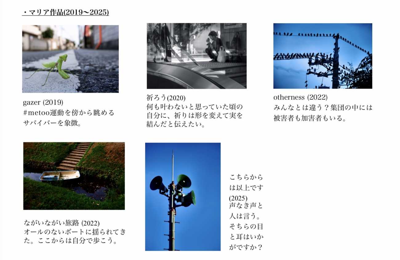 作品は、筆者の主催・写真表現指導に基づく制作実践の成果物例で制作者は各参加者である。本論文では第2章のインターナショナルユースと第3章の性暴力被害者による長期写真表現活動からの参照作品である。