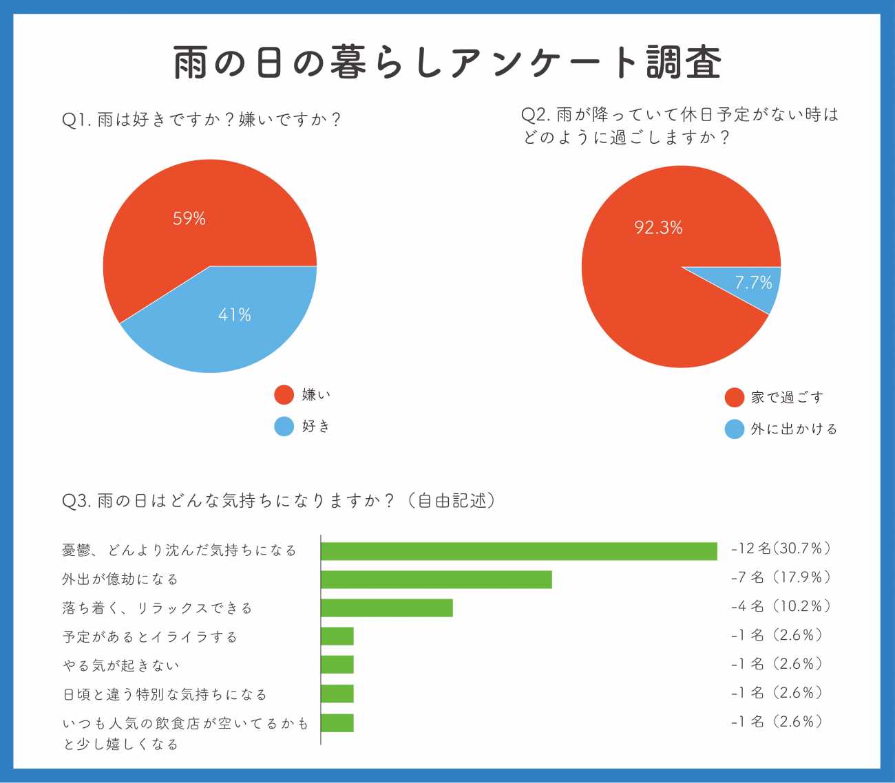雨が降ると人々はどのような行動をとるのかアンケート調査を行いました。すると、雨に対して嫌いな気持ちを抱えている人が多く、雨が降ると屋内で過ごし、身を守る行動をとる傾向にあることがわかりました。