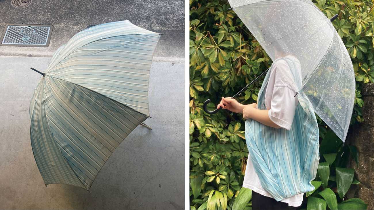 ・かさbag 1つの傘を解体し、その生地から作ったバッグ。 骨組みが折れて使わなくなったお気に入りの傘を長く利用することができ、雨の日のお出かけをちょっと楽しい時間に生まれ変わらせます。