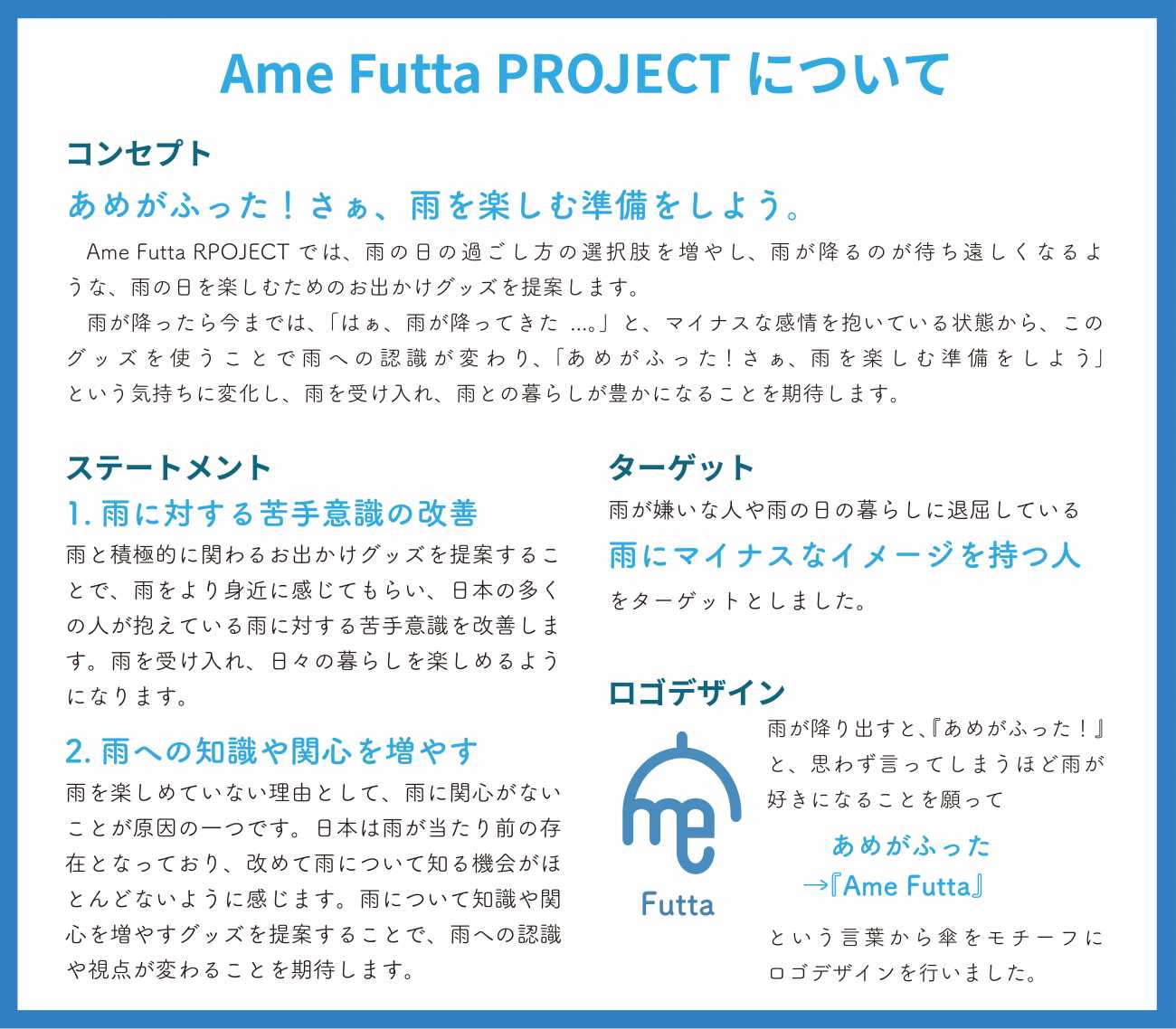現状を改善するために、Ame Futta RPOJECT では、雨の日の過ごし方の選択肢を増やし、雨が降るのが待ち遠しくなるような、雨の日を楽しむためのお出かけグッズを提案します。
