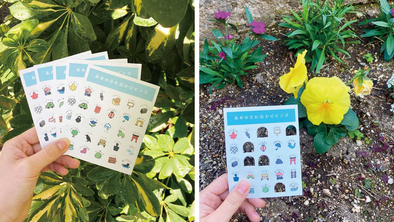 ・あめの日お出かけビンゴ 雨が降る中で、絵に当てはまるものを探して街中を散策するビンゴ。 このビンゴを通じて、晴れの日とは違う、街の新しい表情を見つけるきっかけになればと思います。