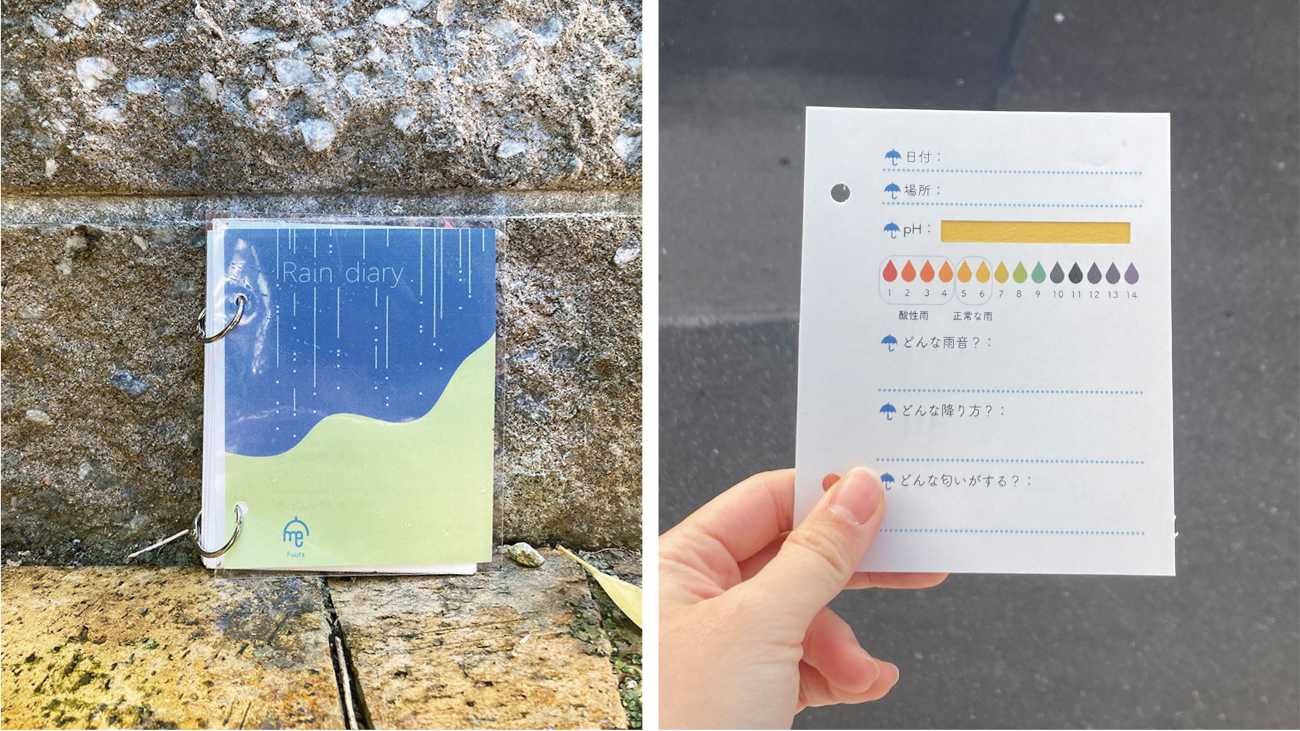 ・雨の観察日記 雨音や匂い、降り方の強さやpH値について、日々の雨の記録ができる日記。 この日記を使うことで、雨が降った日の思い出を風景と共に思い出し、雨により関心を持つようになることを期待します。