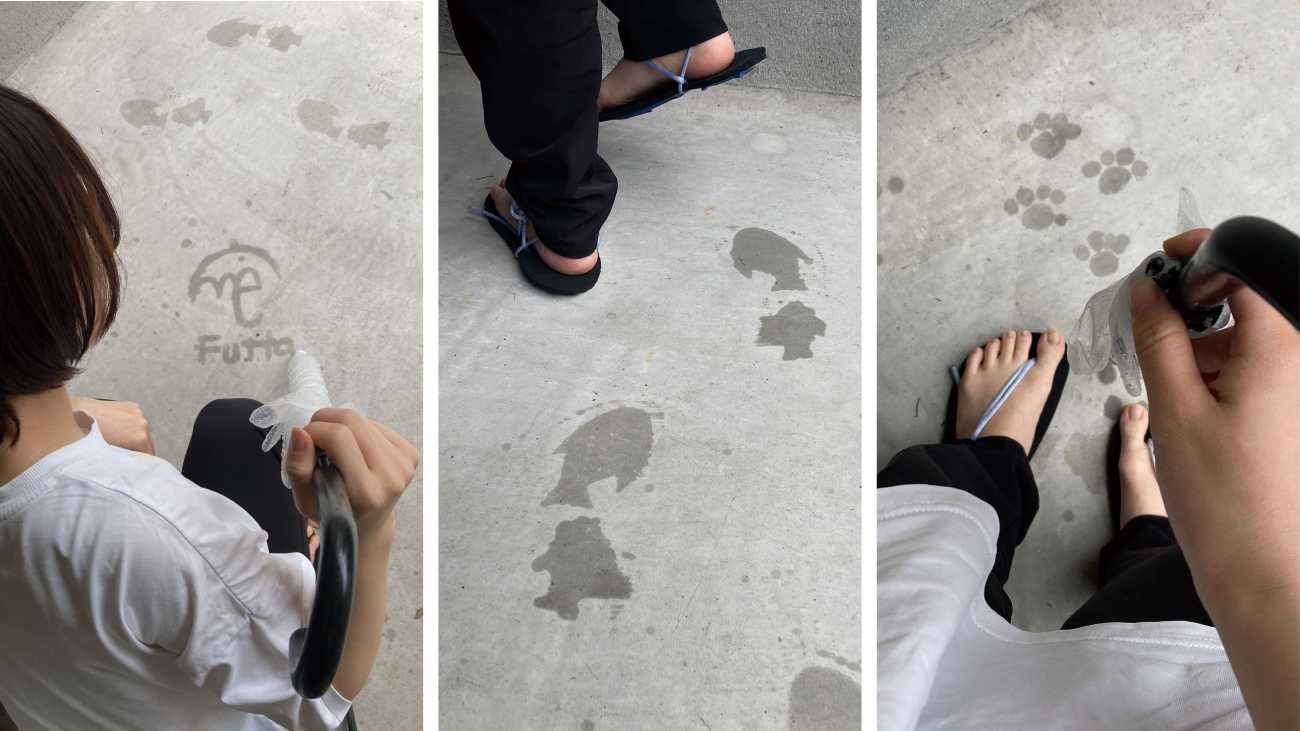 ・足跡サンダル(真ん中) 水を得て泳ぎ出した魚が足跡に現れるサンダル。 ・かさふで(左)、足跡スタンプ(右) 傘の先端に装着し、雨に濡らすことで、乾いた地面がキャンパスとなり、絵を描けます。