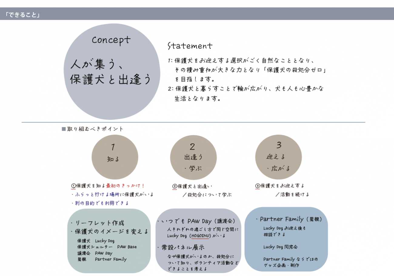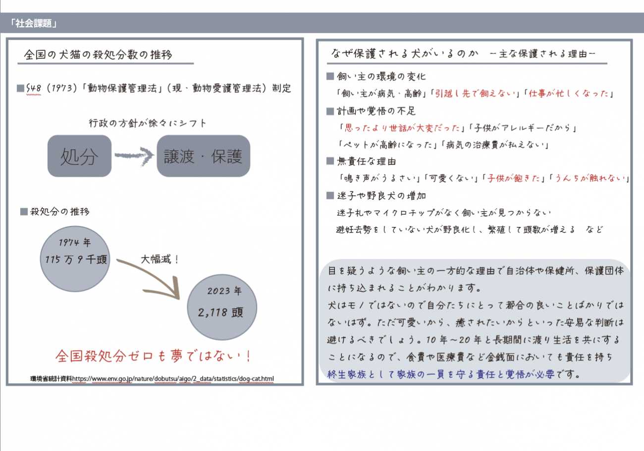 そこで、「犬の殺処分をなくすこと」そのためにデザインの力でできることを探ろうという発想に至りました。なぜ保護される犬がいるのか、殺処分の歴史と推移、現状の社会の仕組みなどを調査し社会課題を探りました。そこから新しい視点で取り組むべきことを提案します。