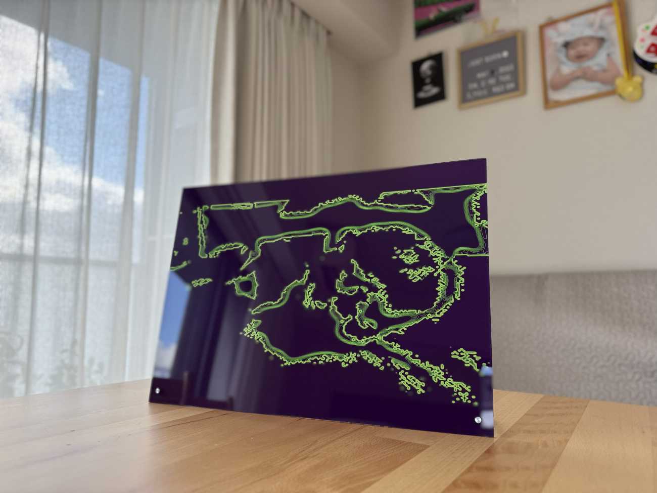 生後二か月の息子が、うつぶせ姿勢から初めて首を持ち上げた瞬間を捉えた写真。