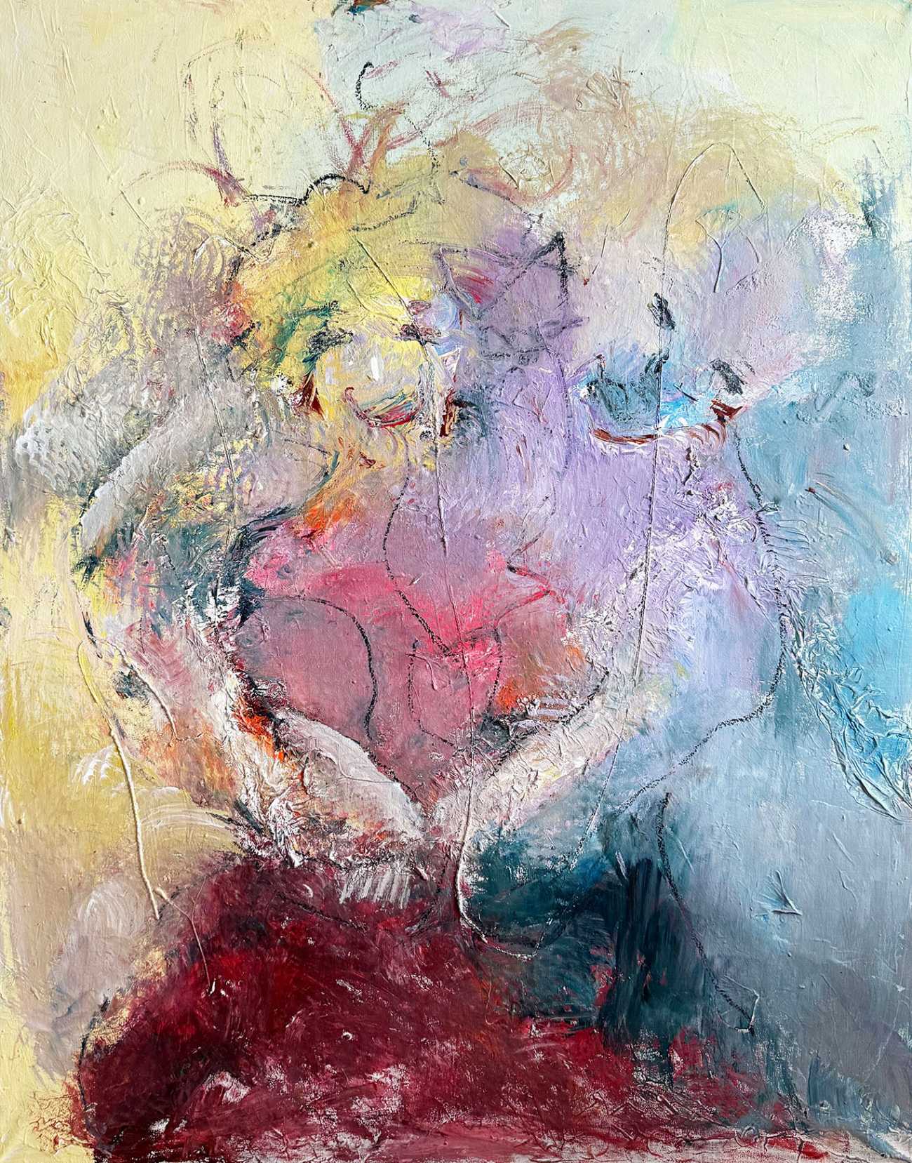 本創作シリーズは「喜怒哀楽」を核心となる感情の脈絡として、四つの具象的な場面を通じ て身体と感情との対話関係を構築している。作品の命名は、あえて直接的な感情ラベルを回 避し、代わりに叙事性に満ちた題名によって観者を没入的な解釈空間へと導く。──「君が 僕に愛を語るとき」は「喜」の到来を捉え、微妙な身体のしぐさによって愛が確認される瞬 間を凝縮する。「僕のチーズを誰が動かしたのか」は「怒」の根源を表し、張り詰めた身体 の態勢を通して秩序が崩されたときの防御的な不安を露わにする。「あの年、花が咲き月が 満ちた頃」は「哀」の詩情を託し、静止した身体と光影の交錯によって記憶に宿る温かな哀 愁を織り上げる。「あの夏、静かな海」は「楽」の澄明を示し、伸びやかな身体のリズムに よって内面と世界との和解を暗示する。シリーズ全体は身体を感情の地形としてとらえ、具 現化された場景の中で内的経験の翻訳と昇華を完成させている。 本シリーズの作品は、主に抽象形式で表現されています。