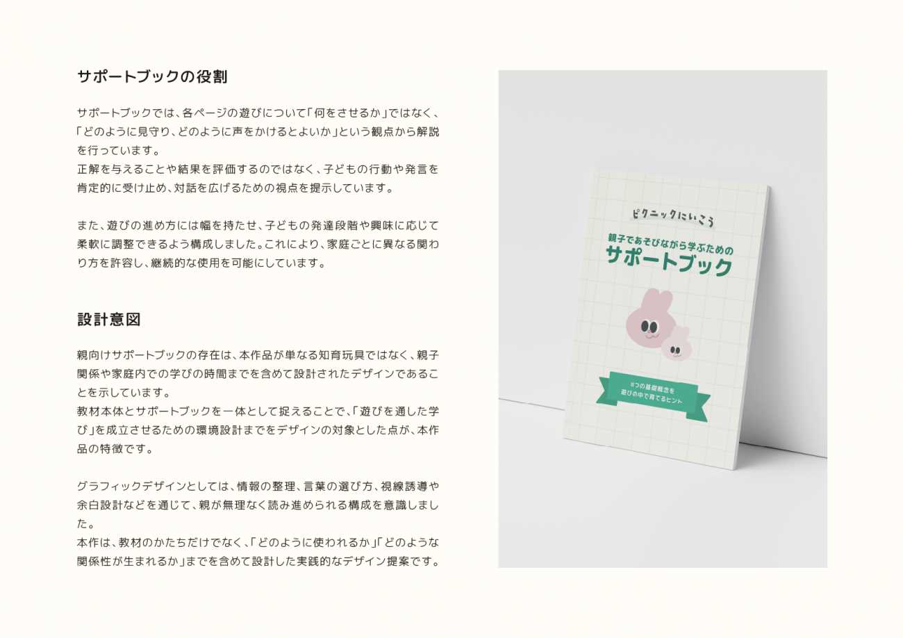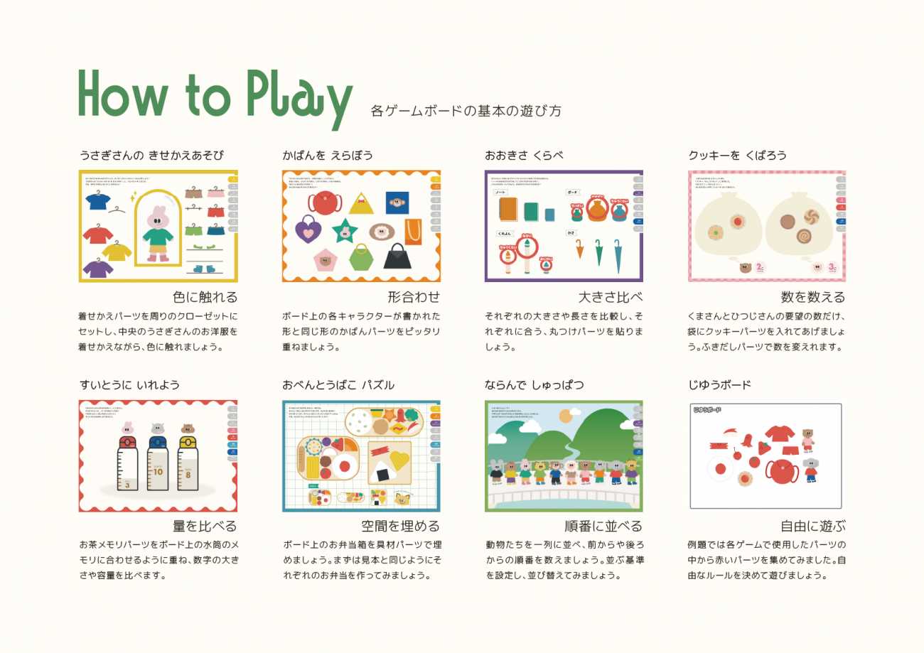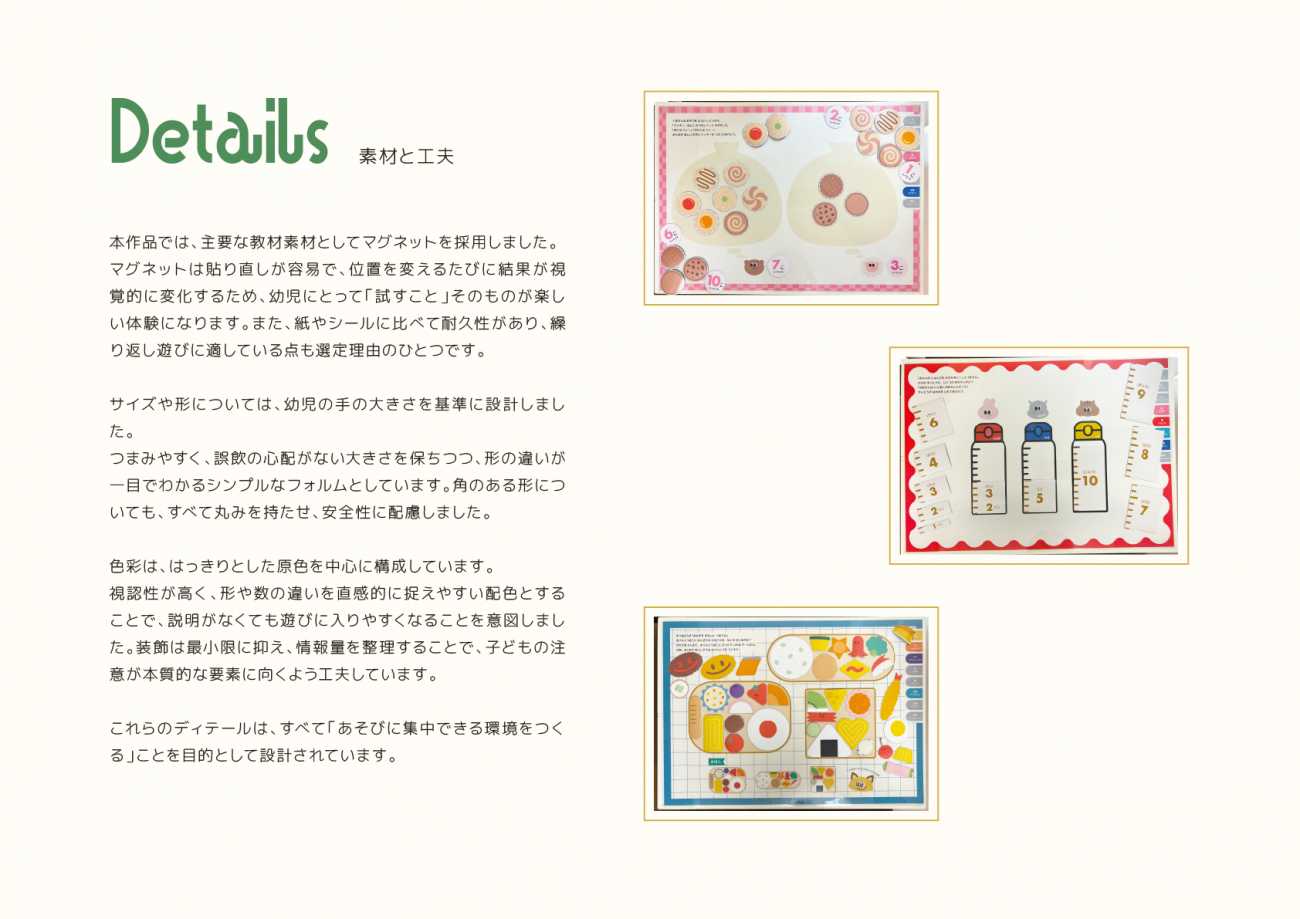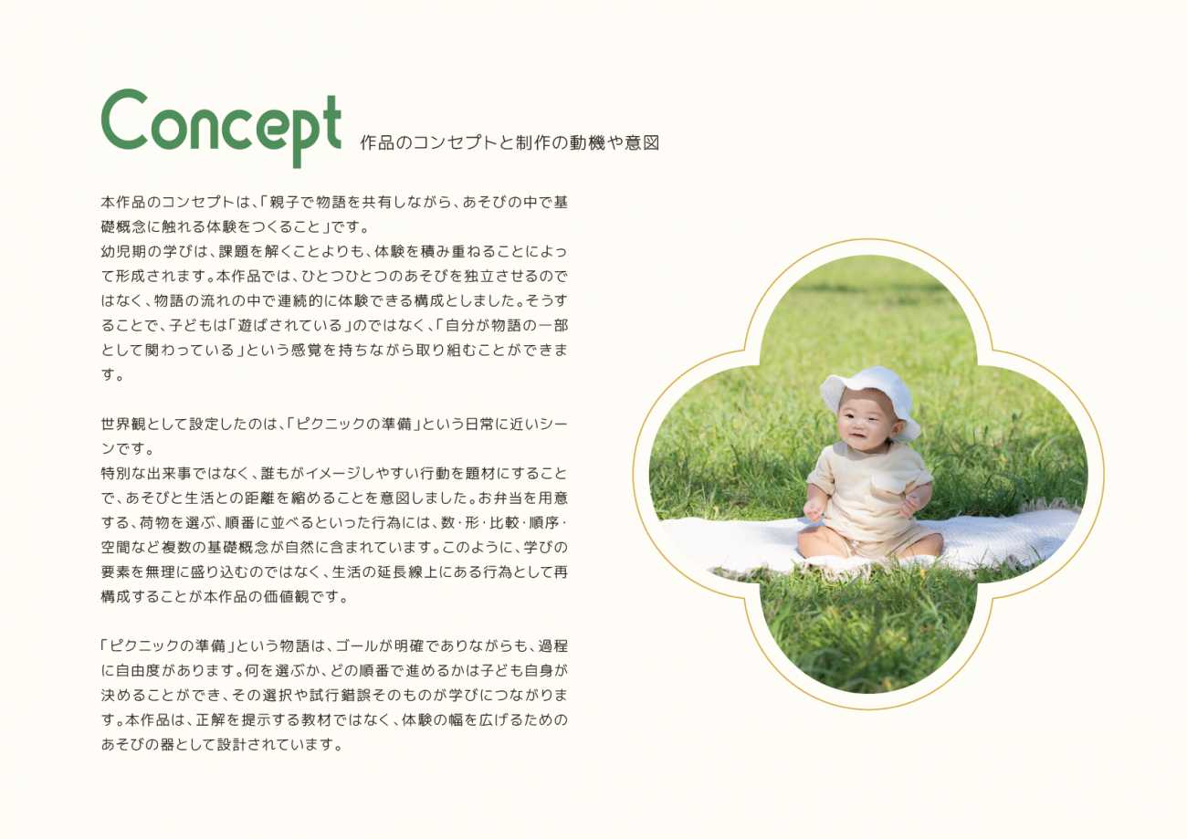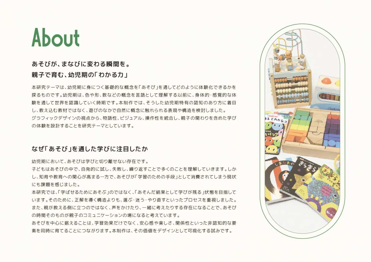 全体を通して、正解を求めるのではなく、対話や気づきを生み出すことを目的とした設計とし、家庭の中で繰り返し遊べる知育体験を提案しています。