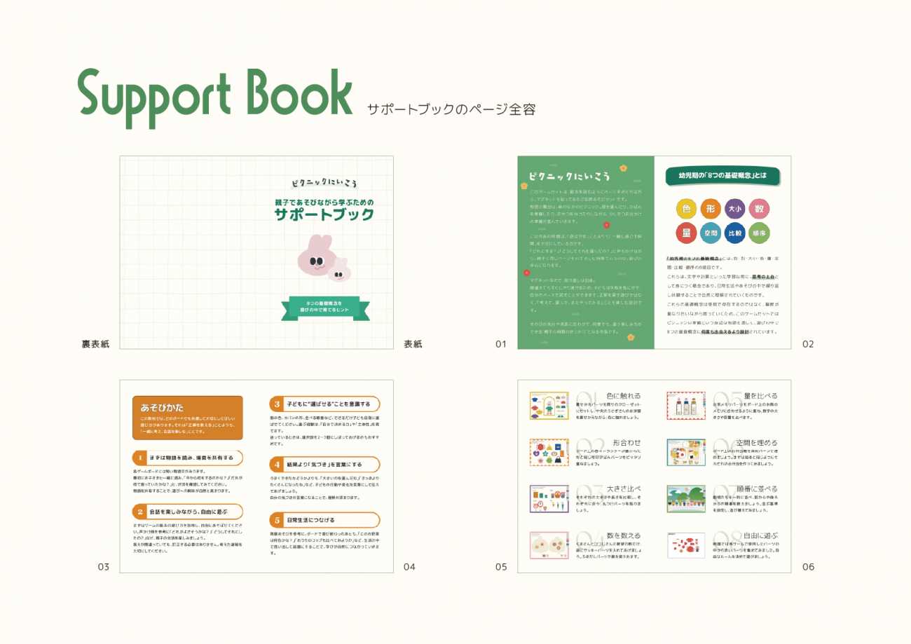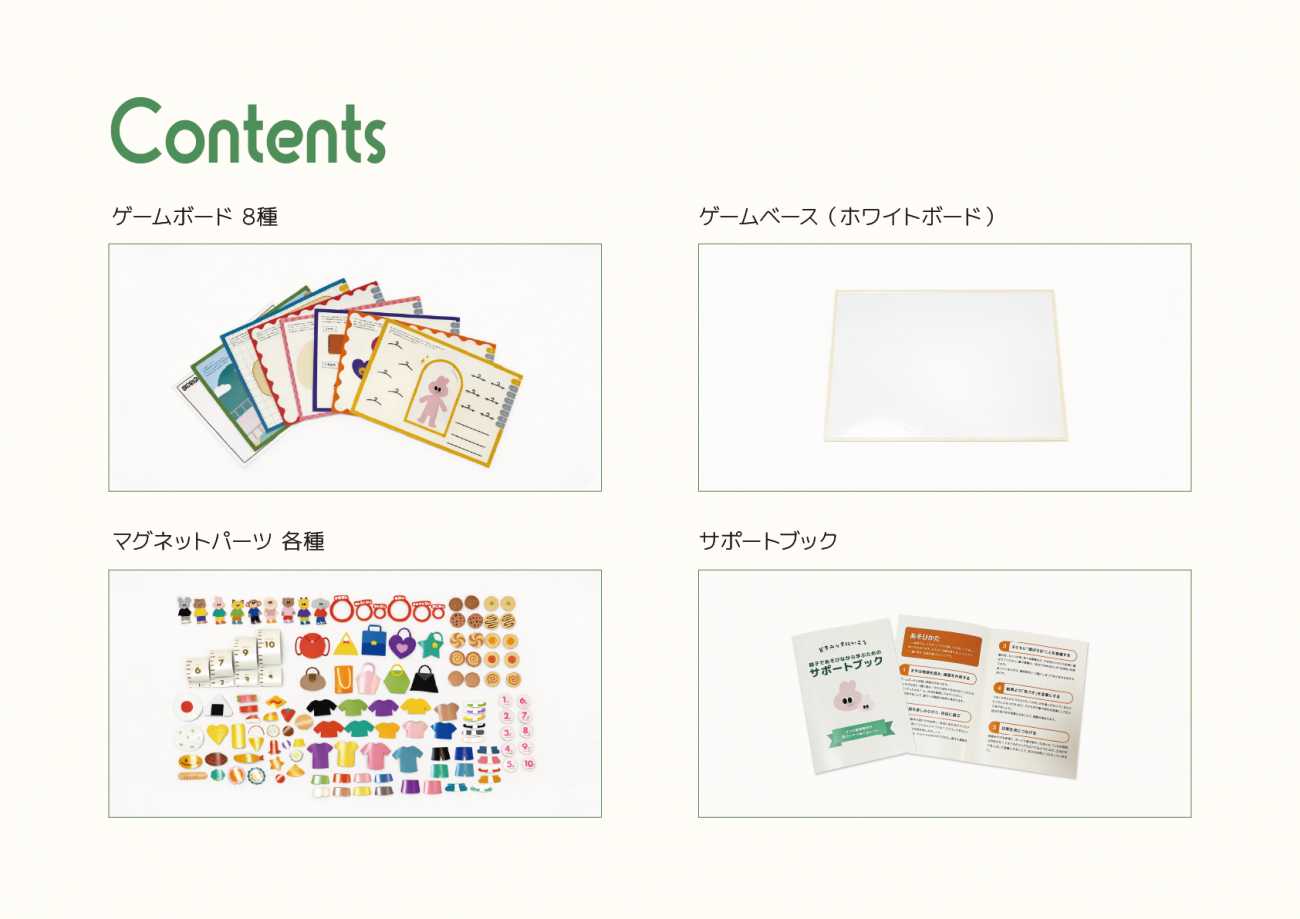 A3サイズのマグネットボードとゲームボード全8ページで構成されており、「ピクニックの準備をする」という一連の物語に沿って遊びが展開していきます。