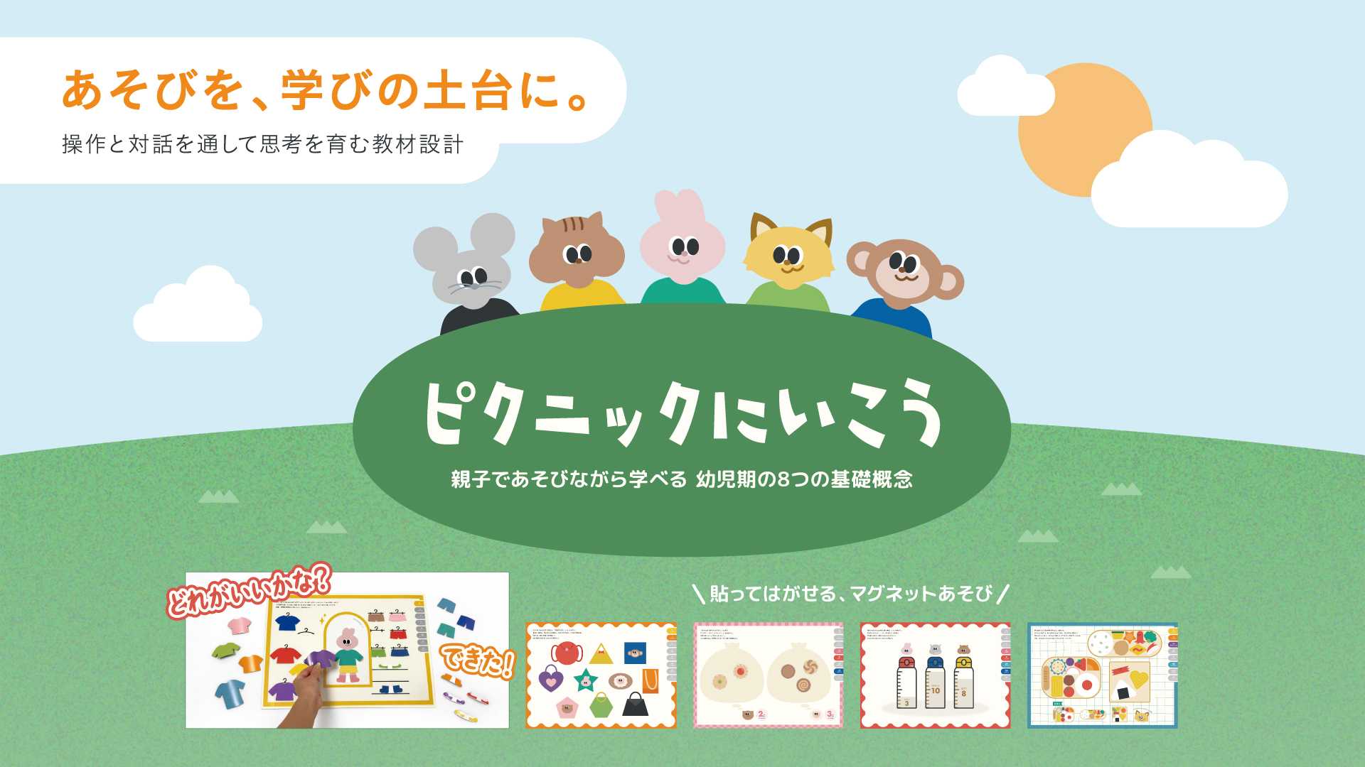 本作品「ピクニックにいこう」は、幼児期に身につけたい基礎的な理解を、あそびと物語を通して体験的に学べる知育ゲームセットです。