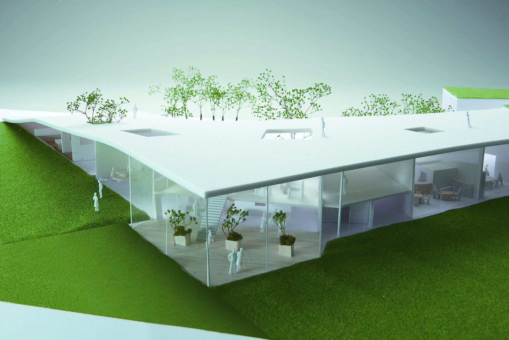 学校に行くのが楽しいのは友達に会えるからです。お互い助け合える村社会の地域特性を受け継げる様、たくさんの友達が出来る異なる学年交流の空間を造りました。また、学校は子どもを拒絶・威圧するような鋭角的なのものではなく、招き入れ成長を静かに包み込む器である繭玉建築だと考えました。